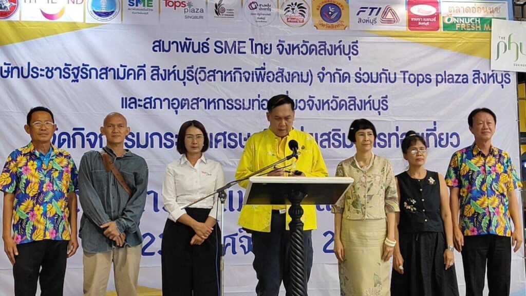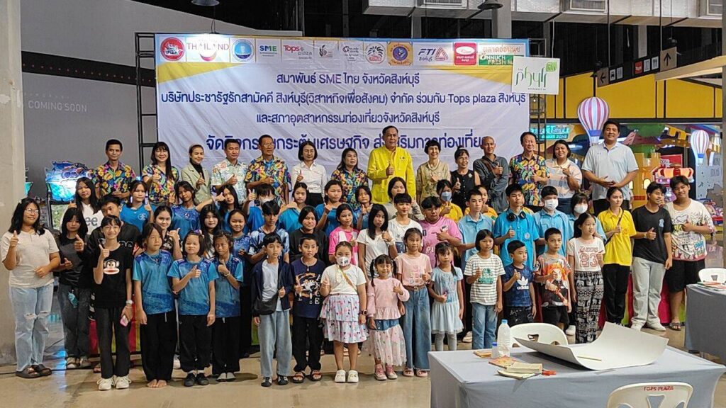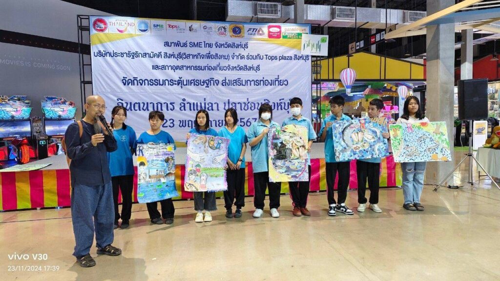วันนี้วันที่ 23 พฤศจิกายน 2567 สมาพันธ์ SME ไทยจังหวัดสิงห์บุรี ร่วมกับห้าง top plaza สิงห์บุรี บริษัทประชารัฐรักสามัคคีสิงห์บุรีวิสาหกิจเพื่อสังคมจำกัด สมาคมส่งเสริมและพัฒนาธุรกิจท่องเที่ยวจังหวัดสิงห์บุรี และบ้านควายอาร์ต จัดกิจกรรมกระตุ้นเศรษฐกิจและส่งเสริมการท่องเที่ยว การประกวดจิตรกรรมจากวัสดุแผ่นเรียบ ในหัวข้อ “จินตนาการ ลำแม่ลา ปลาช่อนสิงห์บุรี” โดยมีนายวราดิศร อ่อนนุช รองผู้ว่าราชการจังหวัดสิงห์บุรี มาเป็นประธานในพิธีเปิดการจัดกิจกรรมฯ และยังได้รับเกียรติจาก ดร.เกตุชญา วงษ์เพิก ผู้อำนวยการสำนักงานเขตพื้นที่การศึกษาประถมศึกษาสิงห์บุรี ให้เกียรติมาร่วมพิธีเปิดฯ ในการนี้ นางอรพรรณ รักถนอม ประธานสมาพันธ์ SME ไทยจังหวัดสิงห์บุรี ในฐานะประธานจัดกิจกรรมฯ ได้กล่าวรายงานวัตถุประสงค์ของการจัดงาน เพื่อเป็นการกระตุ้นเศรษฐกิจ ส่งเสริมผู้ประกอบการขนาดกลางและขนาดเล็ก ส่งเสริมด้านการท่องเที่ยว ให้มีความคึกคักมากขึ้นในหลายๆ ด้าน ที่สำคัญเพื่อให้เด็กและเยาวชนได้สร้างสรรค์ผลงานศิลปะ ที่ส่งเสริมจินตนาการและความคิดสร้างสรรค์มากยิ่งขึ้น