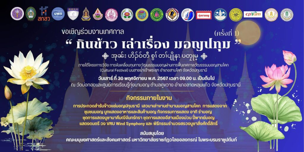 เมื่อวันที่ 24 พฤศจิกายน 2567 เวลา 15:00 น ณ ทุ่งนามอญ ตำบลระแหง อำเภอลาดหลุมแก้ว จังหวัดปทุมธานี โดยมหาวิทยาลัยวลัยลงกรณ์ในพระบรมราชูปถัมภ์ นำโดยผศ.ดร.ดรุณศักดิ์ ตติยะลาภะ คณบดีคณะมนุษยศาสตร์และสังคมศาสตร์ พร้อมด้วย ภาครัฐและภาคเอกชนและ ศูนย์การเรียนรู้ทุ่งนามอญ อำเภอลาดหลุมแก้ว จัดงานแถลงข่าว “กินข้าว เล่าเรื่อง มอญปทุมธานี” ครั้งที่ 1 เป็นการสร้างเทศกาลใหม่ ที่เกิดจากงานประเพณี และวัฒนธรรมที่สามารถเชื่อมโยงประวัติศาสตร์มอญสามโคกสายน้ำเจ้าพระยาตลอดทั้งปีของชาวมอญ จังหวัดปทุมธานี ซึ่งจะจัดขึ้นในวันที่ 30 พฤศจิกายน 2567 เวลา 9.00 น และในเวลา18.00 น.จะเป็นพิธิเปิดงานเทศกาลกินข้าวเล่าเรื่องเมืองปทุมครั้งที่1 โดยมี นายสมคิด จันทมฤก ผู้ว่าราชการจังหวัดปทุมธานีมาเป็นประธานในพิธีเปิด