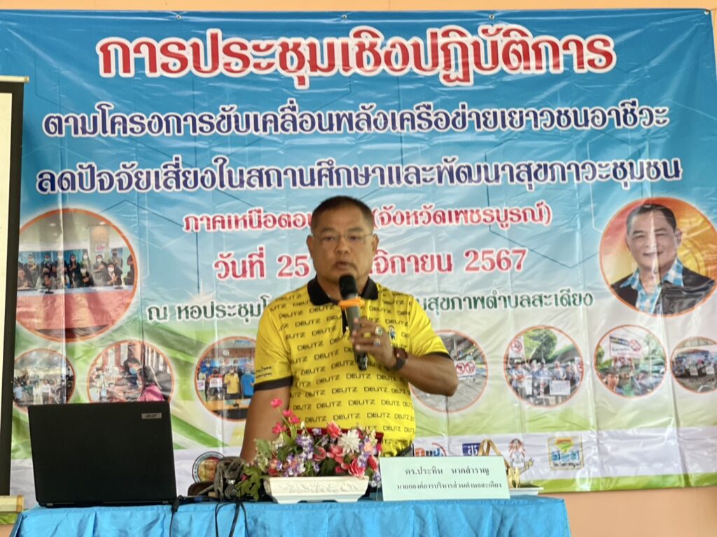 วันที่ 25 พฤศจิกายน 2567 ห้องประชุมโรงพยาบาลส่งเสริมสุขภาพตำบลสะเดียง อ.เมือง จ.เพชรบูรณ์ ดร.ประทิน นาคสำราญ นายกองค์การบริหารส่วนตำบลสะเดียง เป็นประธานเปิดโครงการ“การขับเคลื่อนพลังเครือข่ายอาชีวะลดปัจจัยเสี่ยงในสถาบันการศึกษาและพัฒนาสุขภาวะชุมชนภาคเหนือตอนล่าง มี ร.ต.ต.สุขสัณห์ ภิชัย คณะกรรมการสุขภาพแห่งชาติ เครือข่ายสื่อมวลชนจังหวัดเพชรบูรณ์และอาสาสมัครสาธารณสุขประจำหมู่บ้าน(อสม.) ของตำบลสะเดียง จำนวน 150 คน เข้าร่วม