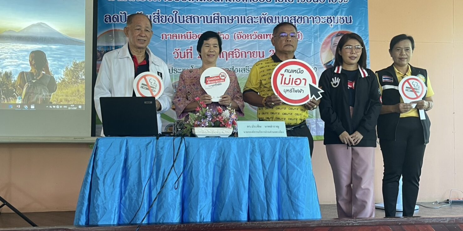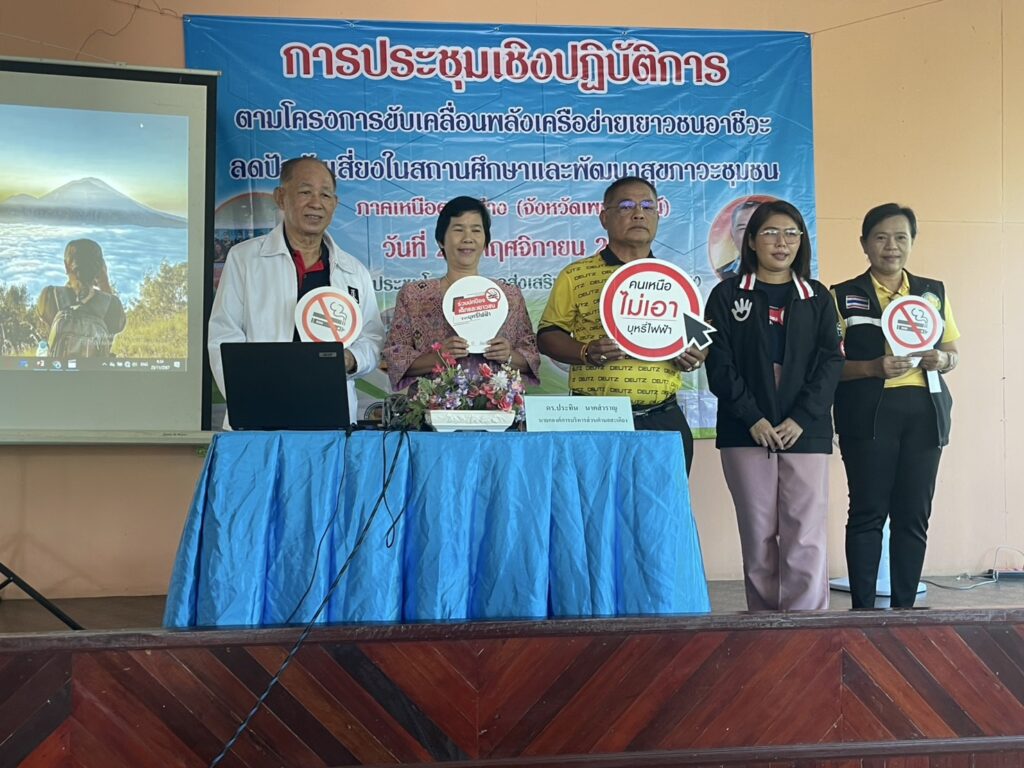 นางสาววรรณิกา หาญกลิ้ง นายกสมาคมองค์กรสาธารณะประโยชน์เพื่อสังคมไทยเข้มแข็งจังหวัดเพชรบูรณ์ ผู้ประสานงานโครงการ กล่าวรายงานวัตถุประสงค์ว่าเนื่องด้วย มูลนิธิคนเห็นคน ได้รับการสนับสนุนงบประมาณจาก กองทุนสนับสนุนการสร้างเสริมสุขภาพ (สสส.) ในการที่จะร่วมกันดำเนินการแก้ไขปัญหาบุหรี่/บุหรี่ไฟฟ้า ที่กำลังระบาดในกลุ่มของ นักเรียน นักศึกษา และเยาวชนที่อยู่ในชุมชนทั้งในเมืองและชนบท ในเขตพื้นที่ภาคเหนือตอนล่างทั้ง 6 จังหวัด คือ พิษณุโลก ตาก สุโขทัย อุตรดิตถ์ พิจิตร และจังหวัดเพชรบูรณ์ ทั้งนี้ ปัญหาบุหรี่ และบุหรี่ไฟฟ้า เป็นอีกหนึ่งปัญหาสำคัญในท้องถิ่น สอดคล้องกับข้อมูลการสำรวจของสำนักงานสถิติแห่งชาติที่ได้ดำเนินการสำรวจพฤติกรรมด้านสุขภาพของประชากร ปี 2564 จะพบว่า คนสูบบุหรี่ส่วนใหญ่อาศัยอยู่ในชนบทมากกว่าในเมือง โดยคนสูบบุหรี่ในชนบทคิดเป็นตัวเลข 19.0% และในเขตเมืองคิดเป็น 15.6% นิโคตินพบได้ทั้งในบุหรี่ และบุหรี่ไฟฟ้า ซึ่งนิโคตินจะออกฤทธิ์กระตุ้นสมองส่วนหน้า หากมีการเสพติดไปแล้วอาจส่งผลให้เกิดความเสียหายทางสมอง ในส่วนที่มีหน้าที่ควบคุมการคิดอย่างมีวิจารณญาณ การตัดสินใจ บุคคลิกและควบคุมพฤติกรรมทางสังคม โดยเฉพาะการเสพติดสารนิโคตินในเด็กและเยาวชน ยิ่งในเด็กที่มีอายุน้อยกว่า 18 ปี ซึ่งอยู่ในช่วงพัฒนาสมอง การได้รับสารนิโคตินอาจส่งผลกระทบที่มีความรุนแรงต่อการพัฒนาสมอง ต่างจากช่วงอายุ 20-25 ปีขึ้นไป แม้จะไม่มีผลทำลายสมองเช่นเดียวกับในวัยเด็กเพราะสมองมีการพัฒนาเต็มที่แล้ว แต่สารนิโคตินยังมีความเสี่ยงต่อสุขภาพ ทั้งโรคหัวใจ โรคซึมเศร้า ปอดอักเสบ มะเร็งปอด และโรคใหม่อย่างโรคปอดอักเสบรุนแรงจากบุหรี่ไฟฟ้า