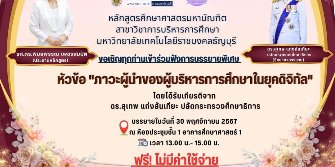 มหาวิทยาลัยเทคโนโลยีราชมงคลธัญบุรี ขอเชิญผู้สนใจทุกท่านเข้าร่วมฟังบรรยายพิเศษในหัวข้อ “ภาวะผู้นำของผู้บริหารการศึกษาในยุคดิจิทัล” เพื่อเสริมสร้างความรู้และแนวทางการพัฒนาภาวะผู้นำในยุคที่เทคโนโลยีมีบทบาทสำคัญในวงการศึกษา