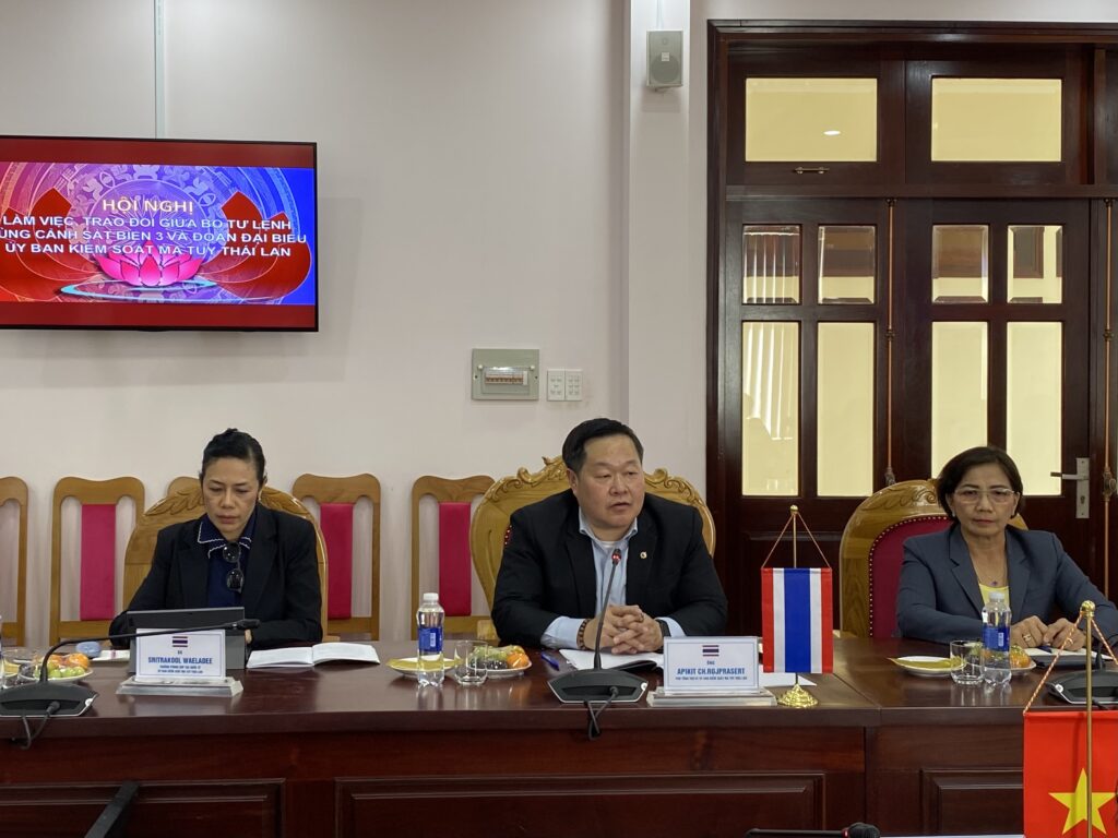 สำหรับประเด็นด้านยาเสพติด รองผู้บัญชาการหน่วยยามฝั่งเวียดนาม ภาค 3 กล่าวว่า ในช่วงปีที่ผ่านมา อาชญากรรมยาเสพติดทางทะเลมีความซับซ้อนเพิ่มมากขึ้น โดยพบการใช้เส้นทางทะเลในการลักลอบขนส่งยาเสพติดและเคมีภัณฑ์เพิ่มขึ้นอย่างต่อเนื่อง อีกทั้งการที่เวียดนามมีชายฝั่งทะเลยาว และน่านน้ำในทะเลจีนใต้เป็นเส้นทางขนส่งสินค้าที่สำคัญแห่งหนึ่งของโลก ทำให้เกิดความท้าทายในการป้องกันอาชญากรรมที่เกี่ยวข้องกับการลักลอบขนส่งยาเสพติด โดยเฉพาะในพื้นที่น่านน้ำทางภาคใต้ของประเทศ บริเวณใกล้กับนครโฮจิมินห์ และพื้นที่ต่อเนื่องกับน่านน้ำของกัมพูชาและไทย ซึ่งอยู่ในความรับผิดชอบของหน่วยยามฝั่งภาค 3 และ 4 ถือเป็นพื้นที่ที่มีความเสี่ยงสูงต่อการลักลอบขนส่งยาเสพติด โดยพบว่าเครือข่ายนักค้ายาเสพติดชาวจีนและไต้หวันมักเปิดกิจการค้าขายยาและเวชภัณฑ์เพื่ออำพรางการลักลอบลำเลียงยาเสพติดในพื้นที่ นอกจากนี้ ยังพบการลำเลียงยาเสพติดรูปแบบใหม่ โดยนักค้ายาเสพติดจะนำยาเสพติดทิ้งลงในทะเลและแจ้งพิกัดให้เรือลำอื่นมารับยาเสพติดดังกล่าวเพื่อนำไปขนส่งต่อไป ทั้งนี้ ที่ผ่านมา หน่วยยามฝั่งเวียดนามได้ร่วมมือกับหน่วยงานที่เกี่ยวข้อง เช่น กรมตำรวจต่อสู้ยาเสพติด กองทัพเรือ และกรมศุลกากร ในการเข้าตรวจยึดและจับกุมยาเสพติดในคดีสำคัญ อาทิ กรณี ปี 2566 : จับกุมนักค้ายาเสพติดเป้าหมายชาวไต้หวัน พร้อมตรวจยึดเคตามีน 1.3 ตัน โดยมีการเปิดบริษัทผลิตยาและเวชภัณฑ์เพื่ออำพรางและสั่งซื้อเคมีภัณฑ์ตั้งต้นสำหรับผลิตยาเสพติด เพื่อนำเข้าไปยังแหล่งผลิตในพื้นที่ สปป.ลาว ผู้ต้องหาให้การรับสารภาพว่าเคยลักลอบนำเข้าเคตามีน 500 กิโลกรัมเข้าไปยัง สปป.ลาว ทั้งนี้เสนอส่งเสริมความร่วมมือกับ สนง.ป.ป.ส. และฝ่ายไทยใน 4 ประเด็น ได้แก่ 1. การแลกเปลี่ยนข้อมูลข่าวสารด้านยาเสพติด,2.เสนอแนวทางการพัฒนาศักยภาพเจ้าหน้าที่ด้านการป้องกันและปราบปรามยาเสพติด,3.ความร่วมมือในการลาดตระเวนทางทะเลเพื่อตรวจตราการกระทำผิดในคดียาเสพติด และ 4.การเพิ่มความร่วมมือในการสืบสวนสอบสวนเครือข่ายนักค้ายาเสพติดเป้าหมายที่ก่ออาชญากรรมทางทะเลต่อไป