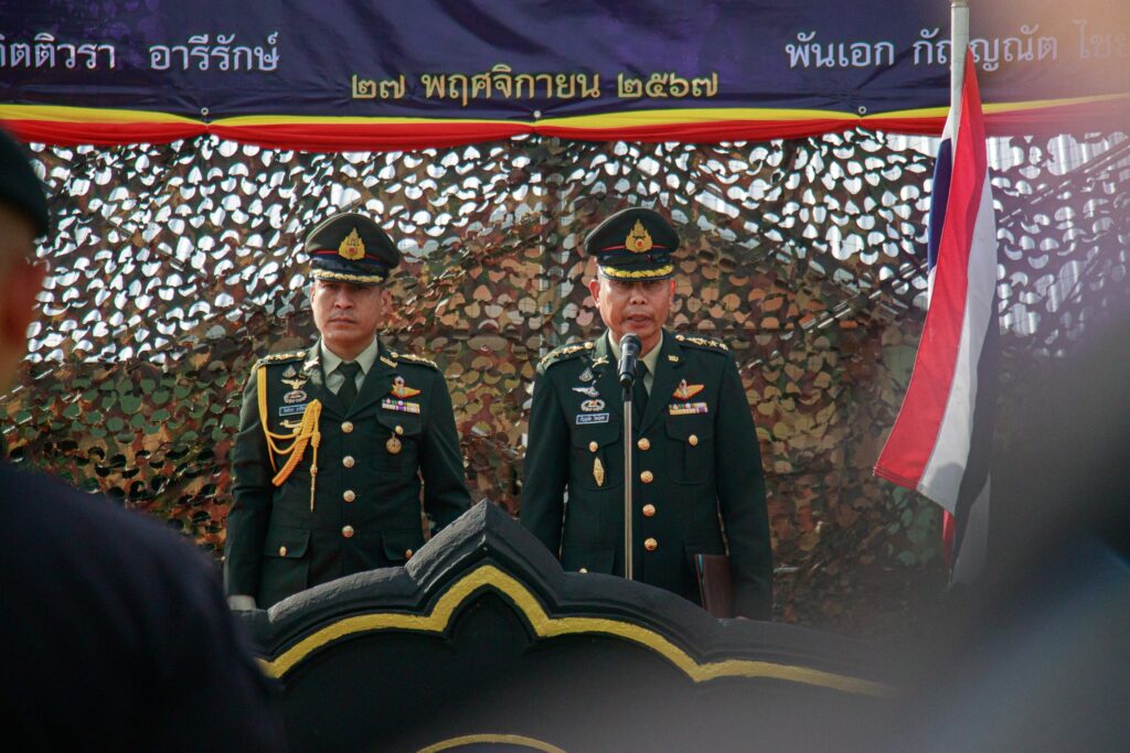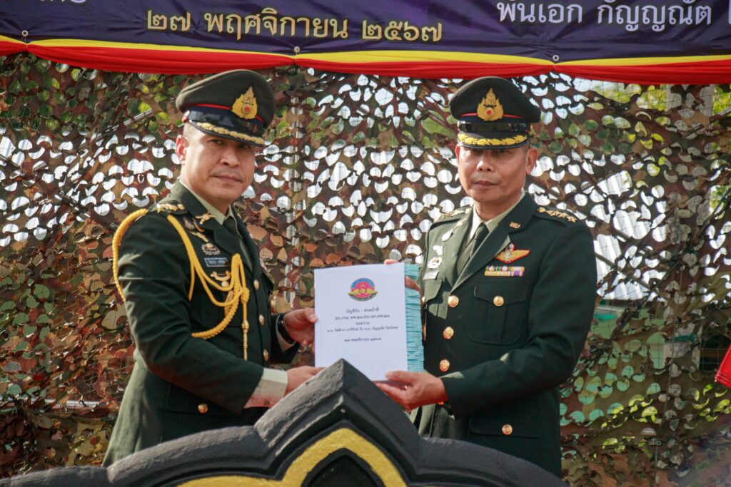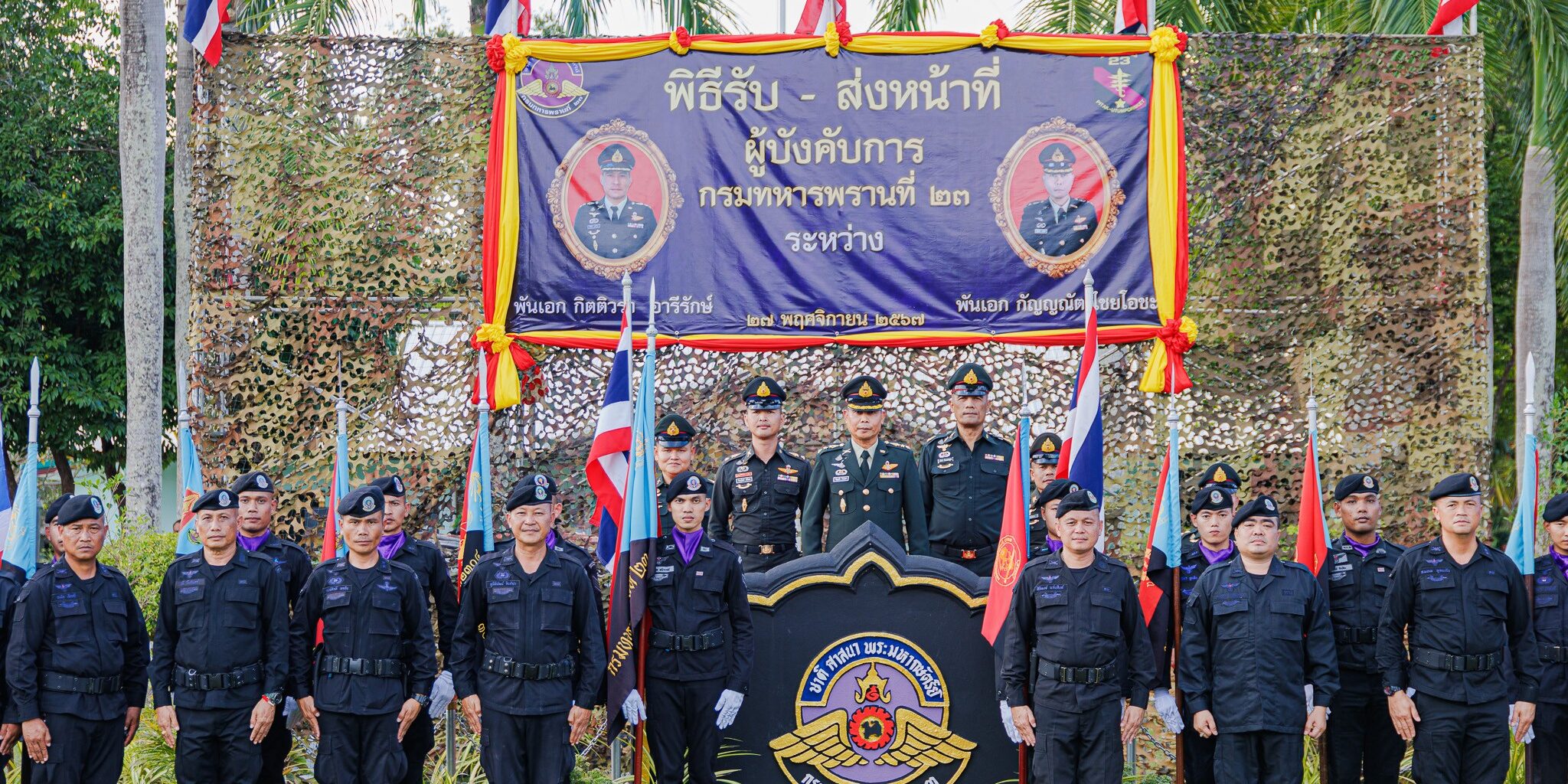 พันเอก กิตติวรา อารีรักษ์ หัวหน้ากองส่งกำลังบำรุงมณฑลทหารบกที่ 29 (ผู้บังคับการกรมทหารพรานที่ 23 (ท่านเก่า)) กล่าวว่า ตามที่ได้มีคำสั่งกองทัพบกให้ พันเอก กัญญณัต ไชยโอชะ มาดำรงตำแหน่ง ผู้บังคับการกรมทหารพรานที่ 23 ตั้งแต่วันที่ 20 พฤศจิกายน 2567 แล้วนั้น ผมขอแสคงความยินดีต่อท่านเป็นอย่างยิ่ง นับตั้งแต่ที่ผมได้ดำรงตำแหน่ง ผู้บังคับการกรมทหารพรานที่ 23 มานับเป็นความภาคภูมิใจอันสูงยิ่งที่ได้มีโอกาสอันสำคัญยิ่ง ที่ได้ตอบแทนบุญคุณแผ่นดินพิทักษ์รักษาเอกราชอธิปไตยของชาติ ดำรงไว้ซึ่งความมั่นคงของสถาบันชาติ ศาสนา พระมหากษัตริย์ เป็นที่พึ่งให้พี่น้องประชาชนในพื้นที่ในทุกโอกาส รวมทั้งการยกระดับสร้างคุณภาพชีวิตที่ดีให้กับกำลังพลและครอบครัว ให้มีความเป็นอยู่ที่ดีพอเพียง เหมาะสมกับสถานภาพเกียรติศักดิ์ศรี ความเป็นทหารชายแดนตลอดระยะเวลา 1 ปี ผมได้รับความร่วมมือร่วมใจจากกำลังพลทุกนายของกรมทหารพรานที่ 23 รวมทั้งครอบครัวที่ได้ร่วมกันปฏิบัติภารกิจ ในทุกภารกิจด้วยความมุ่งมั่น ความทุ่มเท ความเสียสละ ความรักสามัคคี ด้วยไมตรีจิตและมิตรภาพ จนทำให้ประสบผลสัมฤทธิ์ อย่างมีประสิทธิภาพ จึงต้องขอขอบคุณเพื่อนทหารทุกนายด้วยใจจริงไว้ ณ โอกาสนี้หากมีกิจใดๆ ที่จะช่วยสนับสนุนการกิจของ กรมทหารพรานที่ 23 ได้ผมยืนยันมีความยินดีที่จะช่วยเหลืออย่างยิ่ง สำหรับท่านผู้บังคับการกรมทหารพรานที่ 23 ท่านใหม่นั้นท่านเป็นผู้ที่มีความรู้ ความสามารถ ในการปกครองบังคับบัญชากำลังพล ปฏิบัติหน้าที่ด้วยความมุ่งมั่น ตั้งใจ ชื่อสัตย์ สุจริต มาโดยตลอด ผมจึงมีความเชื่อมั่นเป็นอย่างยิ่งว่าท่านจะสามารถปกครอง บังคับบัญชาหน่วย กรมทหารพรานที่ 23 ก้าวไปข้างหน้าได้อย่างสง่างามสร้างความรักความสามัคคีและอุดมการณ์ความเป็นทหารอาชีพตลอดไป