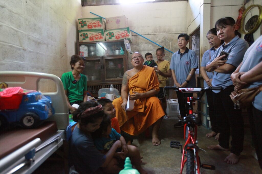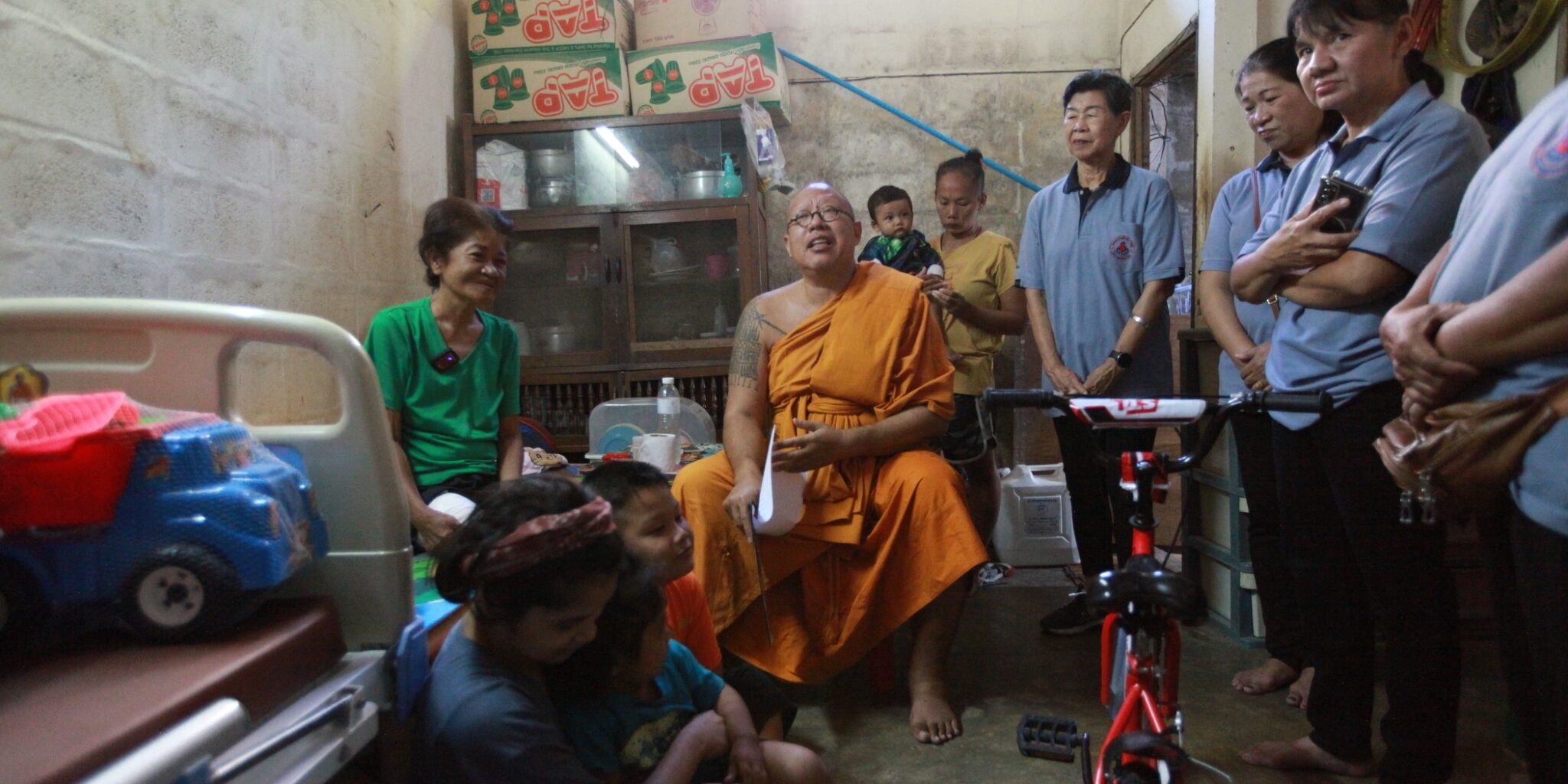 หลวงพี่น้ำฝน ไม่รอเวลาทราบข่าวอดีต อสม.ป่วยหวานถูกตัดขาไร้งาน อาศัยในบ้านกลางเมืองนครปฐม ร่วมกับลูกสาวพิการเดินไม่ได้ พร้อมคนในบ้านอยู่รวมกัน 7 ชีวิต ต้องการเตียงสำหรับผู้ป่วยรุดให้กำลังใจจัดเตียงส่งถึงบ้านทันที อึ้งเข้าไปพบลูกสาวพิการเดินไม่ได้ตั้งแต่กำเนิด ต้องใช้แขนเดินแทนเท้า รีบประสานแพทย์โรงพยาบาลนครปฐม เข้าให้การช่วยเหลือให้ความรู้การมีผู้พิการในบ้าน 2 คน ที่มีหัวเรือหารายได้เพียงคนเดียวต้องอยู่อย่างไร พร้อมดำเนินการให้วัดไผ่ล้อมเป็นศูนย์กลางกระสานความเดือดร้อนของญาติโยม