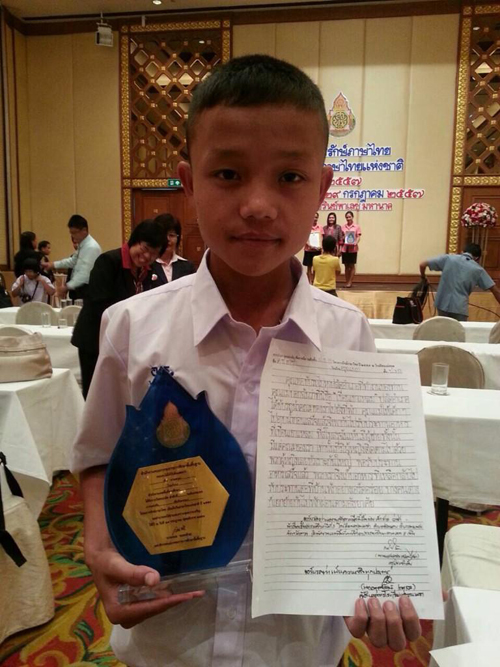 ด.ช.ยาซ่า ชาวพม่า วัย 12 ปี จากโรงเรียนอรุณเมธา คว้าที่ 1 จากการประกวดคัดลายมือวันภาษาไทย