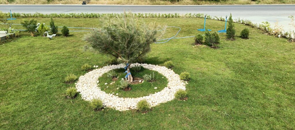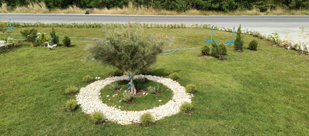 ยังอลังการไม่เบา เนื่องจากมีพื้นที่รอบบ้านค่อนข้างกว้าง ประกอบกับมีต้นไม้ดอกไม้นานาพันธุ์มีต้นหญ้า ปูอย่างสวยงาม ออกแบบเองและลงมือทำเองนักเลงพอ