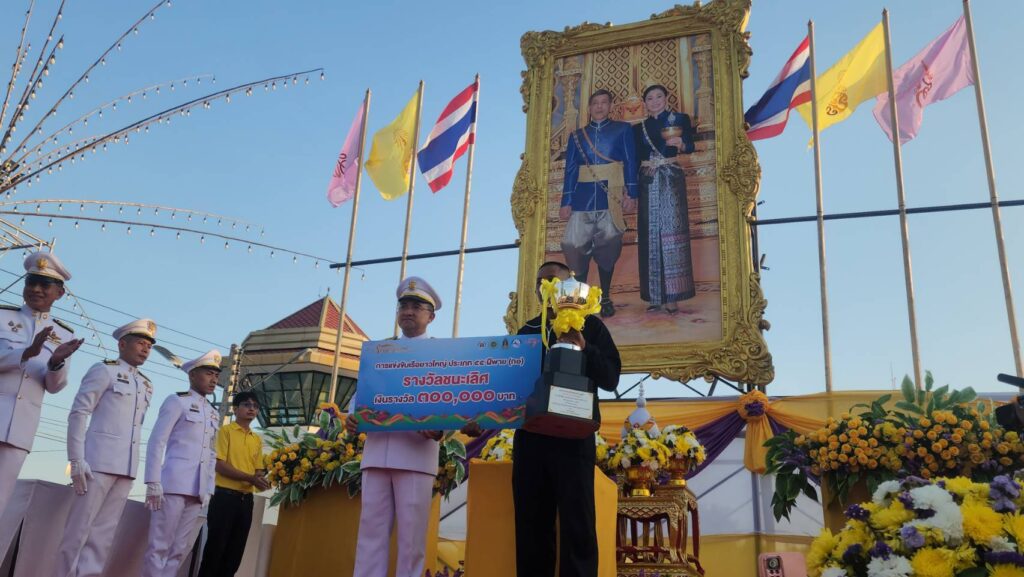 โดยทีมเรือที่ชนะเลิศประเภทเรือยาว ขนาดไม่เกิน 55 ฝีพาย ได้รับถ้วยพระราชทานพระบาทสมเด็จพระเจ้าอยู่หัว พร้อมเงินรางวัล 300,000 บาท ได้แก่ ทีมเรือพายเจ้าแม่ประดู่ทอง ส่วนทีมเรือที่ชนะเลิศประเภทเรื่อยาว ขนาดไม่เกิน 40 ฝีพาย ได้รับถ้วยพระราชทานสมเด็จพระนางเจ้า ฯ พระบรมราชินี พร้อมเงินรางวัล 2000,000 บาท ได้แก่ ทีมเรือพายสิงห์รังสิต ทีมเรือที่ชนะเลิศประเภทเรือยาว ขนาดไม่เกิน 30 ฝีพาย ได้รับถ้วยพระราชทานสมเด็จพระกนิษฐาธิราชเจ้า กรมสมเด็จพระเทพรัตนราชสุดาฯ สยามบรมราชกุมารี พร้อมเงินรางวัล 100,000 บาท ได้แก่ ทีมเรือพายเรืองแสง และประเภทเรือพายม้า ไม่เกิน 10 ฝีพาย ชนะเลิศได้แก่ทีมเรือพาย เทพณฤทธิ์ รับเงินรางวัล 100,000 บาท