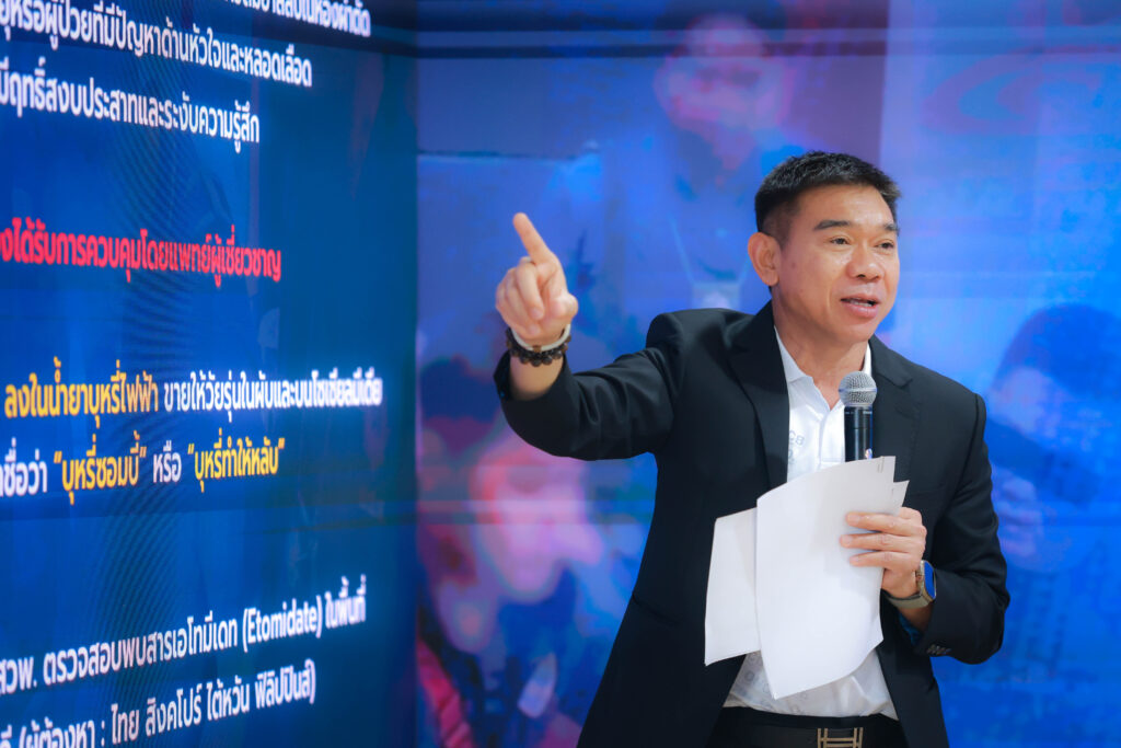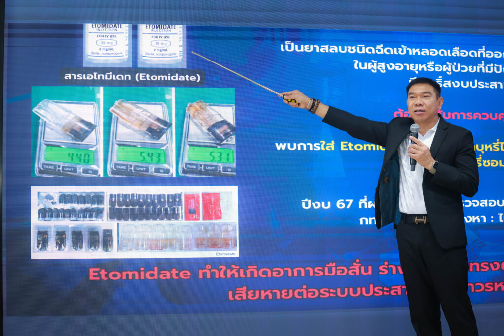 พลตำรวจโท ภาณุรัตน์ หลักบุญ (เลขาธิการ ป.ป.ส.) กล่าวว่า สารเอโทมีเดท (Etomidate) เป็นยากระตุ้นให้สลบชนิดออกฤทธิ์ระยะสั้นๆ แต่ออกฤทธิ์เร็ว ซึ่งต้องได้รับการควบคุมโดยแพทย์ผู้เชี่ยวชาญ ปัจจุบันพบว่ามีการนำมาใช้ในทางที่ผิด นิยมนำมาเสพโดยผสมใส่ในบุหรี่ไฟฟ้า ปัจจุบันเริ่มแพร่ระบาดในสาธารณรัฐประชาชนจีน ซึ่งการเสพสารเอโทมีเดท (Etomidate) อาจทำให้เกิดอาการมือสั่น ร่างกายสั่น ทรงตัวไม่ได้ และอาจส่งผลให้เกิดความเสียหายต่อระบบประสาทแบบถาวร หรือหยุดหายใจ สำหรับประเทศไทย สารเอโทมีเดท (Etomidate) เป็นยาควบคุมพิเศษ ตาม พ.ร.บ.ยา พ.ศ.2510 การนำเข้า ครอบครอง ผลิต ต้องได้รับอนุญาตจาก อย.