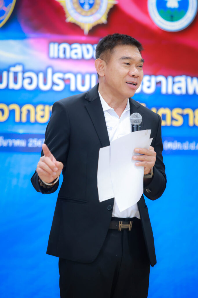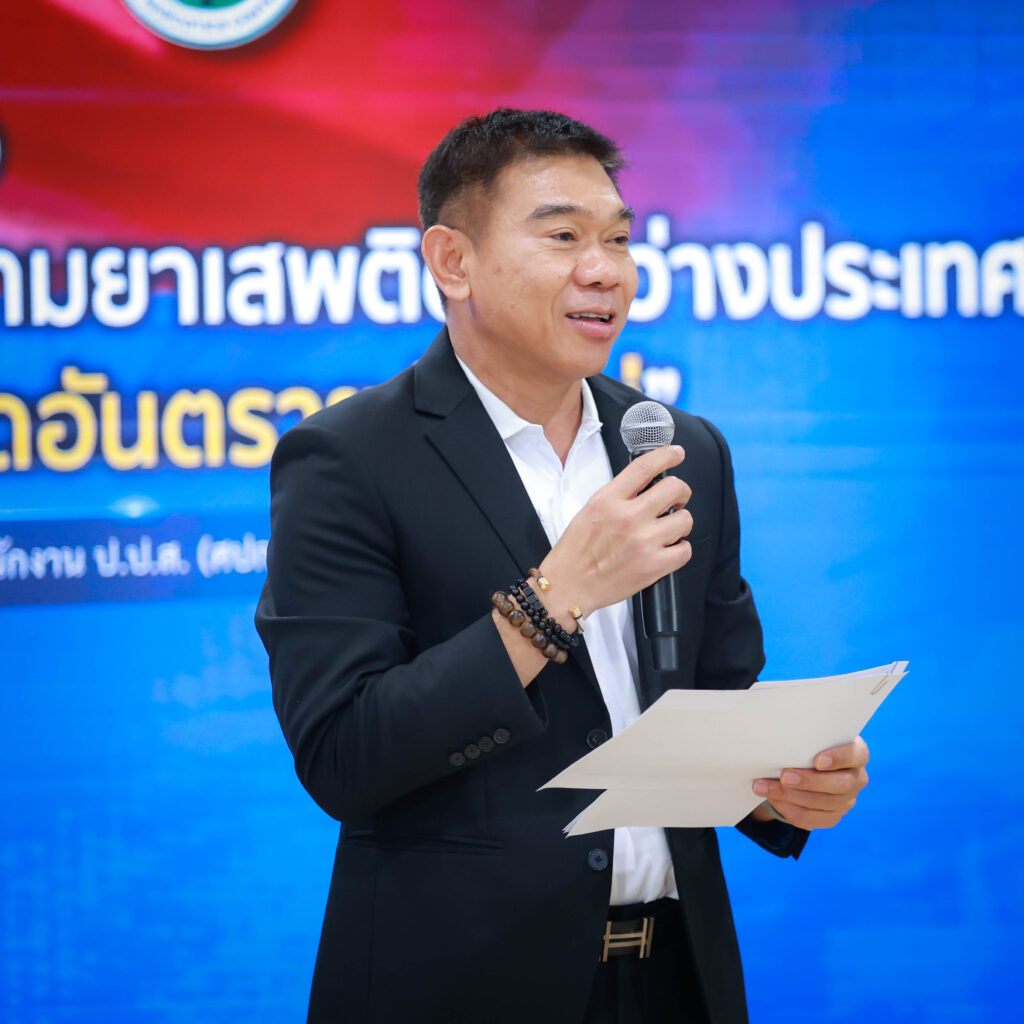 วันศุกร์ที่ 6 ธันวาคม 2567 พลตำรวจโท ภาณุรัตน์ หลักบุญ เลขาธิการ ป.ป.ส. พร้อมด้วย นายปฤณ เมฆานันท์ ผู้อำนวยการ สำนักปราบปรามยาเสพติด แถลงข่าวการบูรณาการความร่วมมือระหว่าง สำนักงาน ป.ป.ส.,สำนักงานตรวจคนเข้าเมือง และ คณะกรรมาธิการควบคุมยาเสพติดแห่งชาติ สาธารณรัฐประชาชนจีน (National Narcotics Control Commission : NNCC) จับกุม นายหลิน ไห่เทา (Lin Haitao) สัญชาติจีน บุคคลตามหมายจับคดียาเสพติดของสาธารณรัฐประชาชนจีน รวมทั้งมีพฤติการณ์เป็นผู้จัดหาและสั่งการลักลอบผลิต Etomidate จากประเทศไทย เพื่อเตรียมไปจำหน่ายที่สาธารณรัฐประชาชนจีน