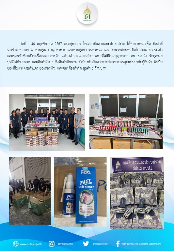 ทั้งนี้ กรมศุลกากรได้ดำเนินการตามนโยบายของรัฐบาล ที่ให้ปกป้องสังคม โดยเข้มงวดในการตรวจสอบการนำเข้าส่งออกสินค้าให้ถูกต้องตามกฎหมายศุลกากร และกฎหมายอื่นๆ ที่เกี่ยวข้อง โดยระหว่างเดือนพฤศจิกายนที่ผ่านมา กรมศุลกากรได้ทำการจับกุม ยาเสพติด เช่น โคเคน,ยาบ้า,เมฟีโดรน,MDMA และช่อดอกกัญชา รวมมูลค่าประมาณ 6.12 ล้านบาท รวมถึงได้เคร่งครัดในการจับกุมบุหรี่ต่างประเทศ มูลค่า 2.52 ล้านบาท บุหรี่ไฟฟ้าและอุปกรณ์ มูลค่า 2.06 ล้านบาท นอกจากนี้ สามารถตรวจยึดสินค้าผิดกฎหมาย ซึ่งเป็นของไม่ตรงตามสำแดง ของต้องห้าม ของต้องกำกัด สินค้าละเมิดทรัพย์สินทางปัญญา เช่น เครื่องสำอาง,วัตถุลามก,ตู้คีบตุ๊กตา,ทองคำแท่ง,Starlink,นกแก้ว เป็นต้น