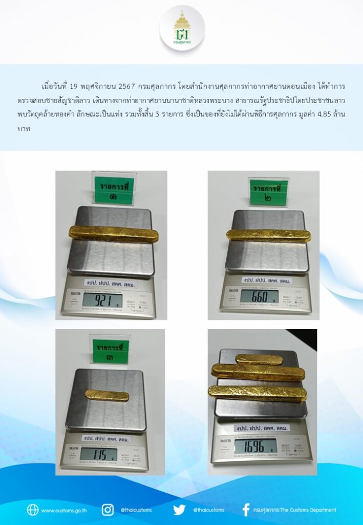 เมื่อวันที่ 19 พฤศจิกายน 2567 กรมศุลกากร โดยสำนักงานศุลกากรท่าอากาศยานดอนเมือง ได้ทำการตรวจสอบชายสัญชาติลาว เดินทางจากท่าอากาศยานนานาชาติหลวงพระบาง สาธารณรัฐประชาธิปไตยประชาชนลาว พบวัตถุคล้ายทองคำ ลักษณะเป็นแท่ง รวมทั้งสิ้น 3 รายการ ซึ่งเป็นของที่ยังไม่ได้ผ่านพิธีการศุลกากร มูลค่า 4.85 ล้านบาท การกระทำดังกล่าวเป็นความผิดตามมาตรา 242 ประกอบมาตรา 166 มาตรา 167 และมาตรา 252 แห่ง พ.ร.บ. ศุลกากร พ.ศ.2560
