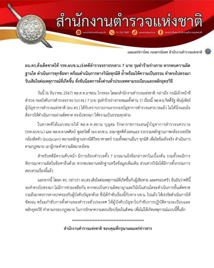 เมื่อวันที่ 6 ธันวาคม 2567 พล.ต.ท.อาชยน ไกรทอง โฆษกสำนักงานตำรวจแห่งชาติ กล่าวถึง กรณีเจ้าหน้าที่ตำรวจ กองบังคับการตำรวจจราจร (บก.จร.) 7 นาย รุมทำร้ายร่างกายขณะตั้งด่านว่า เรื่องนี้ พล.ต.อ.กิตติ์รัฐ พันธุ์เพ็ชร์ ผู้บัญชาการตำรวจแห่งชาติ (ผบ.ตร.) ได้รับทราบรายงานจากกองบัญชาการตำรวจนครบาลแล้ว ไม่ได้นิ่งนอนใจ สั่งการให้ดำเนินการอย่างเด็ดขาด ตรงไปตรงมา ให้ความเป็นธรรมทุกฝ่าย