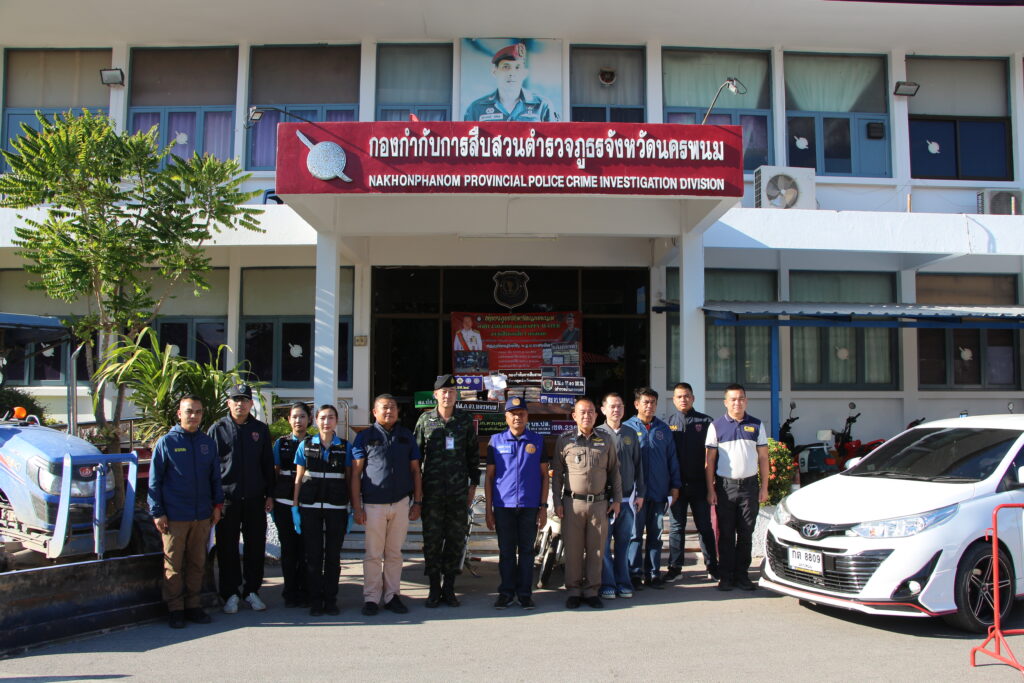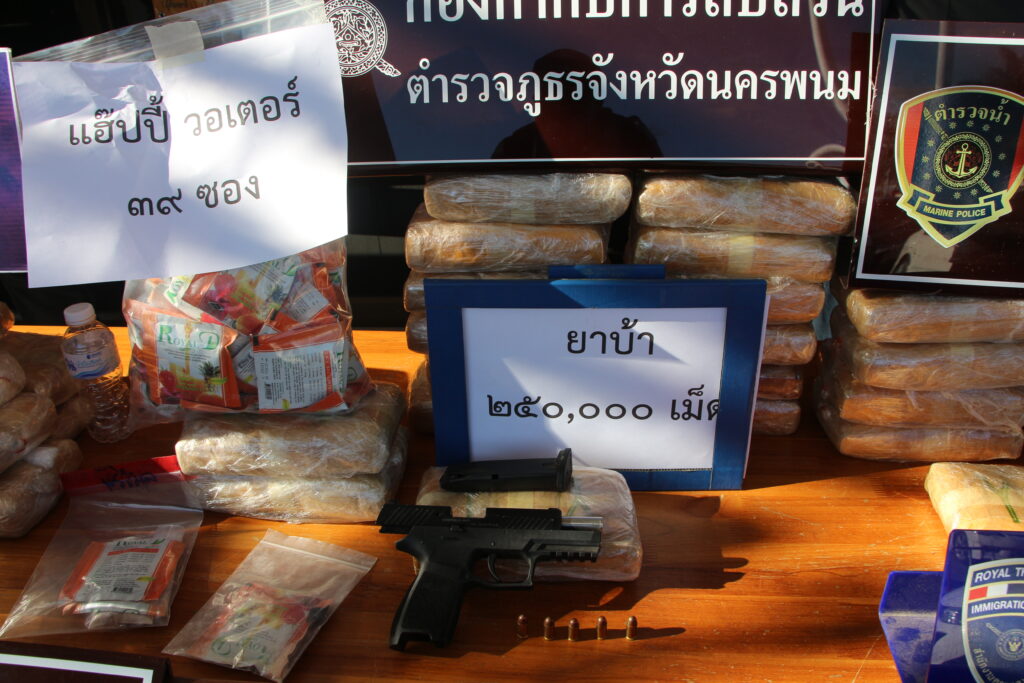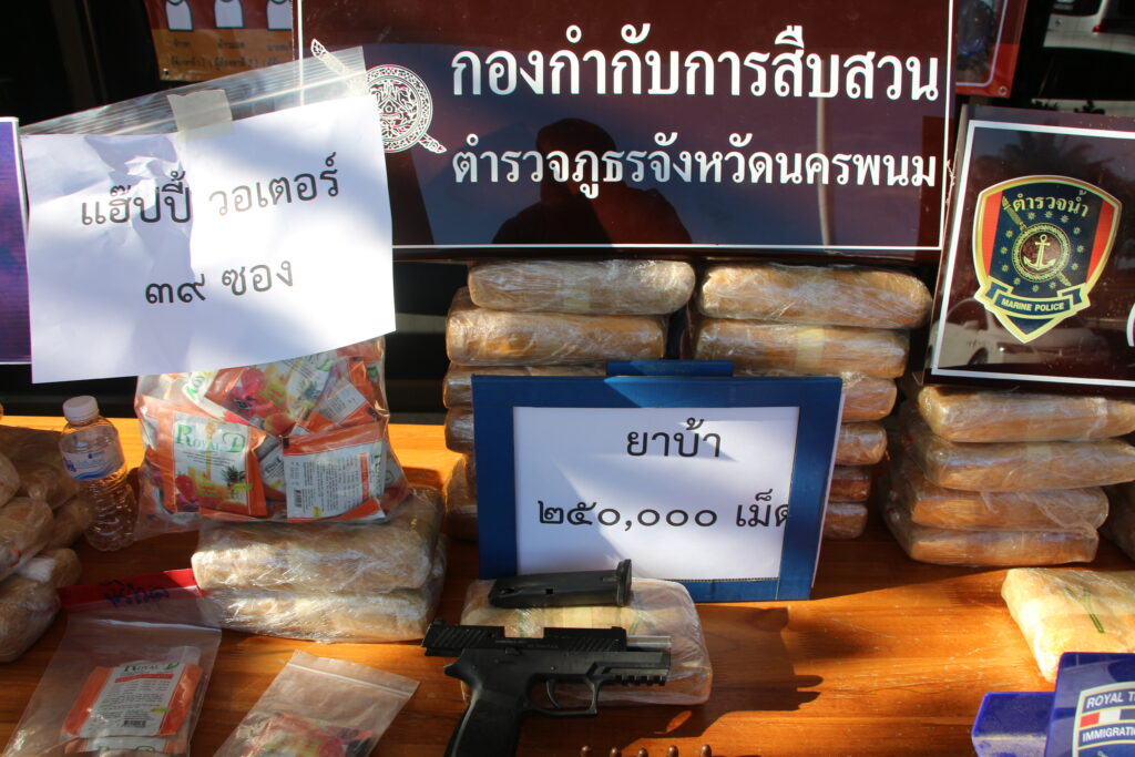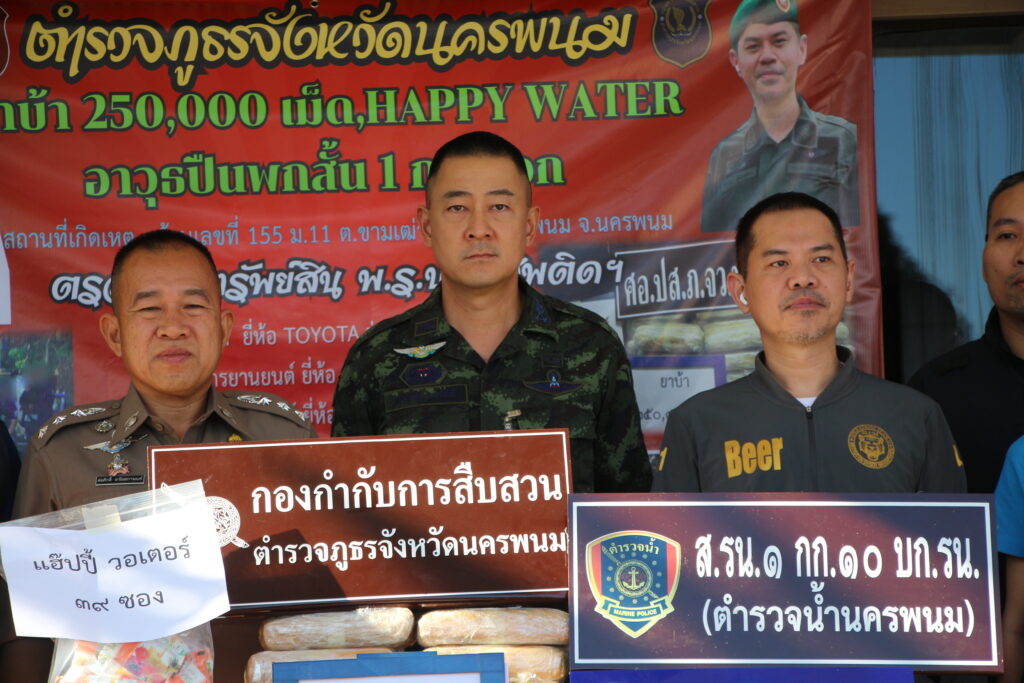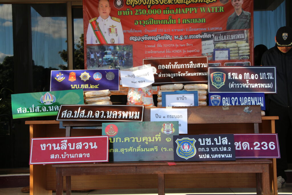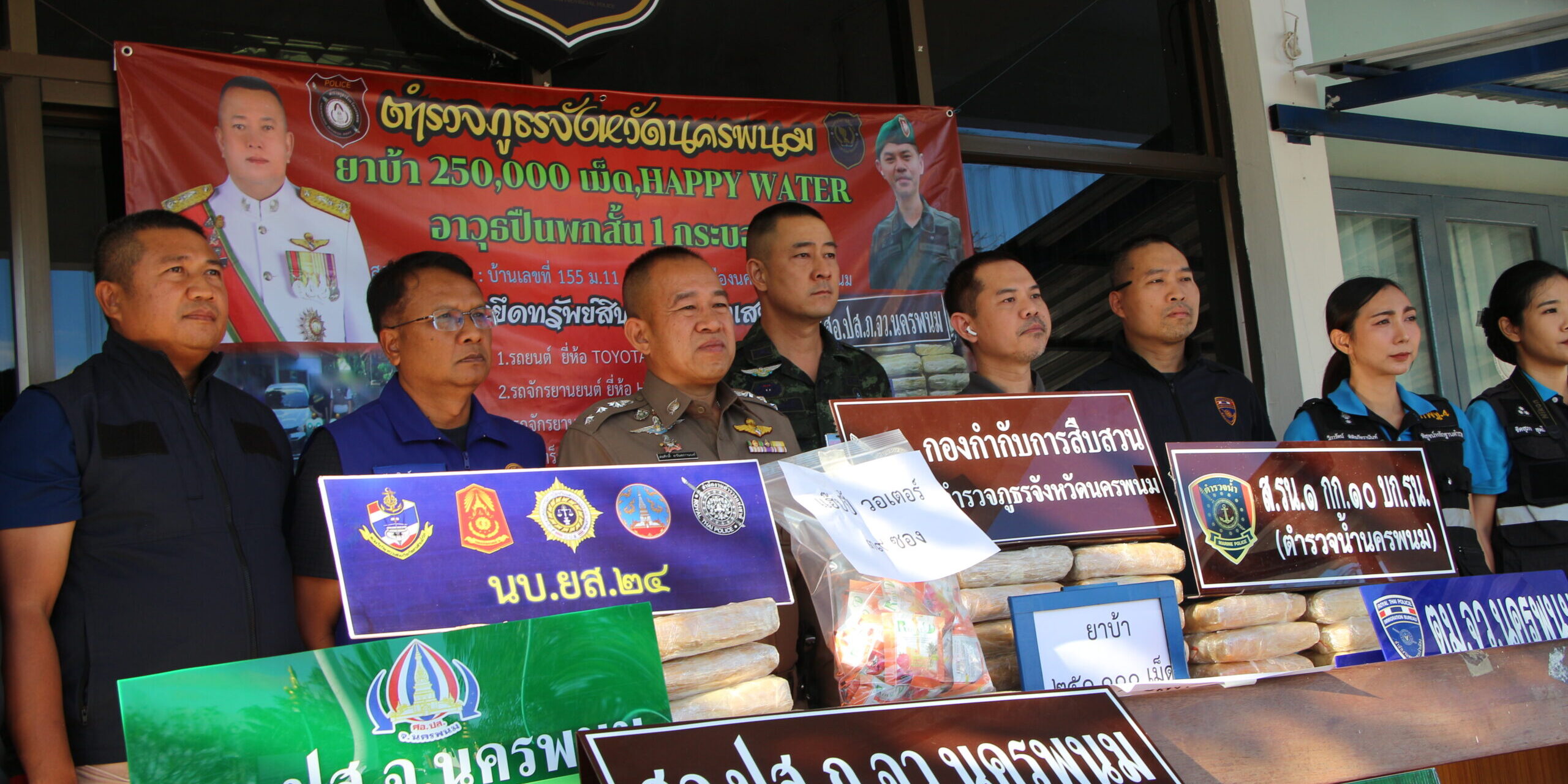 วันที่ 8 ธ.ค.67 ที่กองกำกับการสืบสวน ตำรวจภูธรจังหวัดนครพนม นายนันทวิทย์ นาคแสง ปลัดจังหวัดนครพนม พ.ต.อ.ต่อศักดิ์ อรัณยกานนท์ รอง ผบก.ภ.จว.นครพนม พ.อ.ศรณณัฐ นวลมณี รอง ผอ.ส่วนอำนวยการ นบ.ยส.24 พ.ต.อ.ธนารัตน์ มีทองหลาม ผกก.สืบสวน ภ.จว. นครพนม พ.ต.อ.ณรงค์ เรืองมี ผกก.สภ.บ้านกลาง พ.ต.ท.เกียรติคุณ ดวงแก้ว สารวัตรตรวจคนเข้าเมืองจังหวัดนครพนม พ.ต.ท.หญิง วิภารัตน์ พิพิธภัทรานันท์ นวท.(สบ 3) พิสูจน์หลักฐานจังหวัดนครพนม พร้อมหน่วยงานที่เกี่ยวข้อง ร่วมกันแถลงข่าวตรวจยึดยาบ้า จำนวน 250,000 เม็ด ยาแฮปปี้วอเตอร์ (ชนิดผง) 39 ซอง อาวุธปืนพกสั้น ยี่ห้อ ซิกซาวเออร์ ขนาด .38 กระสุน 5 นัด ผู้ต้องหา 4 ราย พร้อมอายัติทรัพย์ คือ รถไถ รถเก๋ง รถจักรยานยนต์ มูลค่าเกือบ 2,000,000 บาท