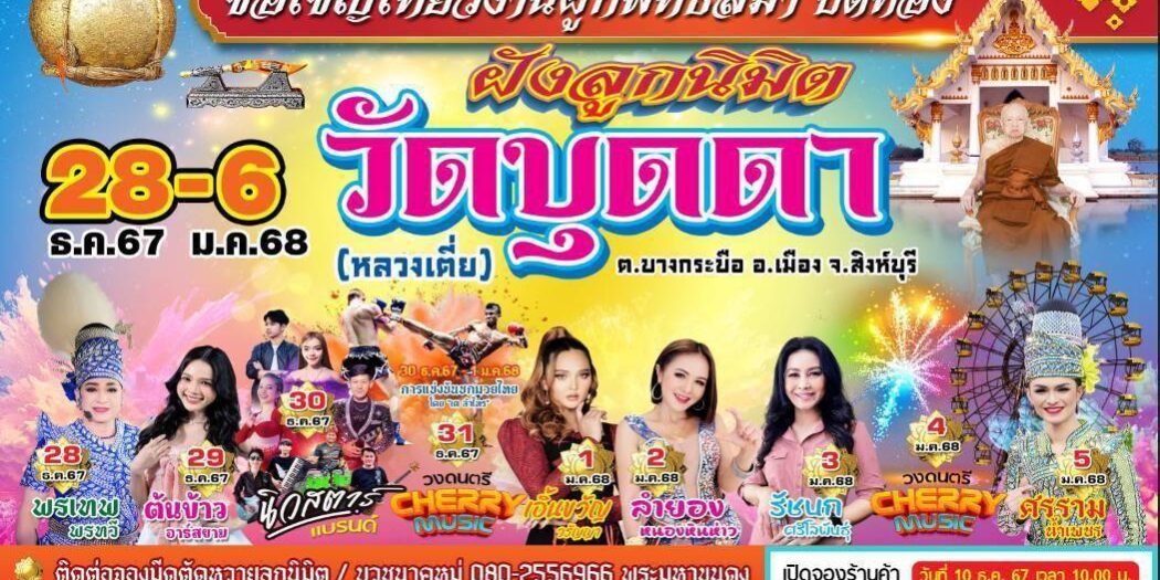 พระอธิการศุภรัตน์ ฐิตธัมมปาโล(หลวงเตี่ย) เจ้าอาวาสวัดบุดดา ขอเชิญร่วมงานผูกพัทธสีมาปิดทองฝังลูกนิมิต ณ วัดบุดดา ตำบลบางกระบือ อำเภอเมือง จังหวัดสิงห์บุรี ในแต่ละวันมีพระสงฆ์ให้ศีล แก่ผู้มาร่วมงานปิดทองลูกนิมิตพร้อมกองบุญหลากหลายให้ท่านได้สร้างทานบารมีและกุศลทานเพื่ออุทิศถวายไม่มีที่สุดไม่มีประมาณ และแจกวัตถุมงคลเพื่อความเป็นสิริมงคล ตลอดทั้งช่วงเทศกาลข้ามปีเถลิงศกใหม่ในวันขึ้นปีใหม่2568