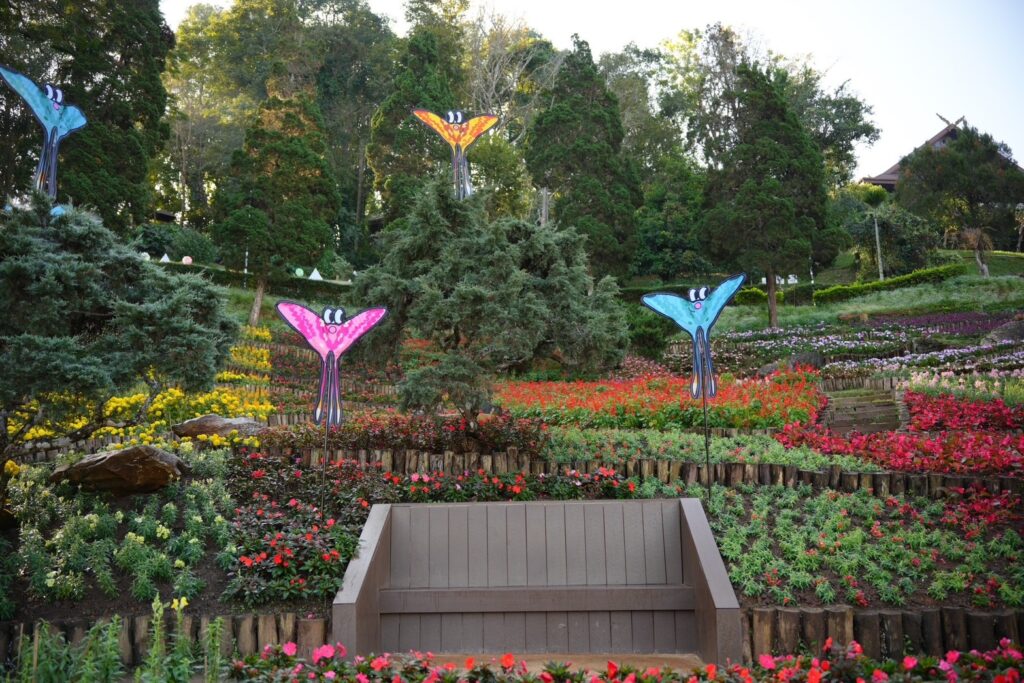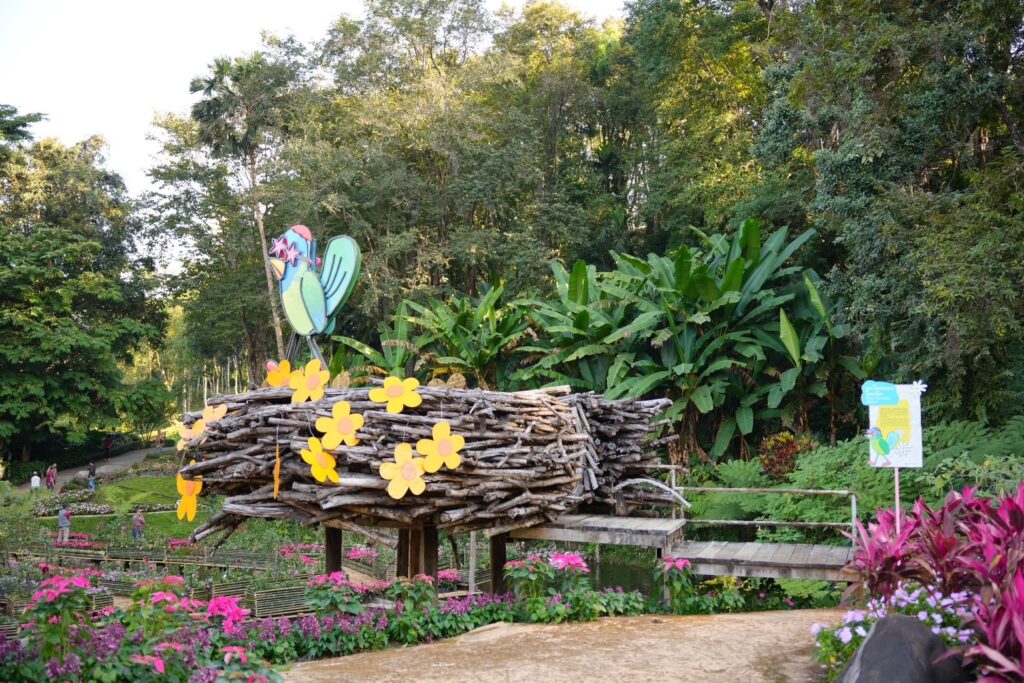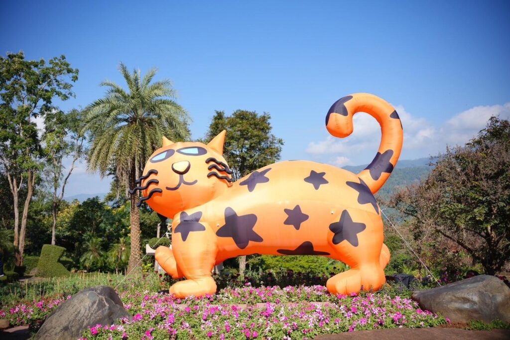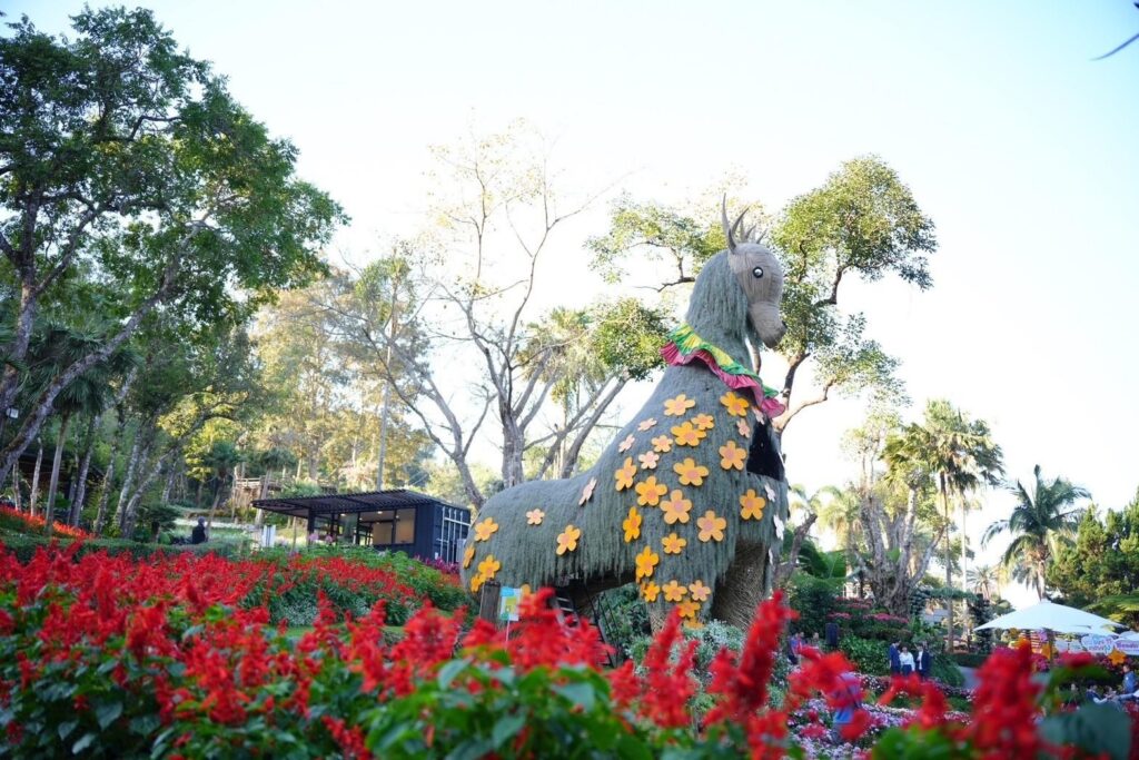 ธีมปีนี้ได้รับแรงบันดาลใจจาก สัตว์ป่าหายากบนดอยตุง เช่น แมวดาว นางอาย ตัวตุ่นและนกโพระดก ศิลปินป๊อปอาร์ตรุ่นใหม่ NEWYEAR ปภากร ศรีกัลยกร ได้นำเรื่องราวเหล่านี้มาถ่ายทอดผ่านตัวละครและประติมากรรมสุดน่ารักที่กระจายอยู่ทั่วสวน เพื่อเดินตามรอย “มุมแชะภาพสุดว้าว” ที่จะทำให้คุณต้องหยิบกล้องมาถ่ายรูป : สะพานนางอายสายรุ้ง : สะพานไม้ที่ทอดผ่านสวนดอกไม้ ท่ามกลางสระมรกต บันไดสายรุ้ง : จุดชมวิวที่สร้างบรรยากาศให้ดูเหมือนคุณกำลังเดินเข้าสู่สายรุ้งแห่งดอยตุง