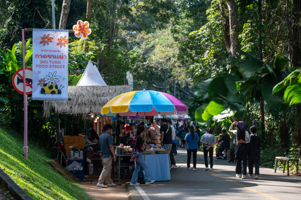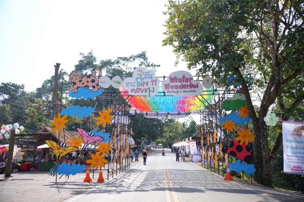 ประติมากรรมสัตว์ป่า : เช่น ตัวตุ่น นักพรวนดินแห่งขุนเขา หรือบอลลูนแมวดาวยักษ์ สวนดอกไม้ระบายดอย : ความงามที่ไม่เคยจางหาย สวนดอกไม้ที่ใหญ่ที่สุดบนดอยตุงปีนี้ได้รับการตกแต่งใหม่ ด้วยดอกไม้เมืองหนาวหลากสีสัน ที่สร้างแรงบันดาลใจและเพิ่มความมีชีวิตชีวา จุดเด่นของสวนนี้คือ : ทุ่งดอกไม้หลากสี : ที่ออกแบบเพื่อสร้างบรรยากาศฤดูหนาว เขาวงกตลอยฟ้า : ชิ้นงานศิลปะที่ผสมผสานประเพณีและความเชื่อของชาวไทใหญ่ ถนนคนเดินดอยตุง : เมื่อวัฒนธรรมชนเผ่ามาเจอกับความร่วมสมัย หนึ่งในไฮไลต์ที่นักท่องเที่ยว ไม่ควรพลาดคือ ถนนคนเดินดอยตุง ซึ่งรวบรวมสินค้า อาหาร และเครื่องดื่มจาก 6 ชนเผ่า ได้แก่ อาข่า ลาหู่ ไทลื้อ ไทใหญ่ ไทลัวะ และจีนยูนนาน อาทิ อาหารชนเผ่าและเมนูพิเศษ ข้าวอิโต หมูดำย่างจิ้มแจ่ว อกไก่ย่างซอสสะเบี๊ยะ ไอศกรีมดอยตุง 3 รสชาติ ที่สร้างจากแรงบันดาลใจของธรรมชาติ