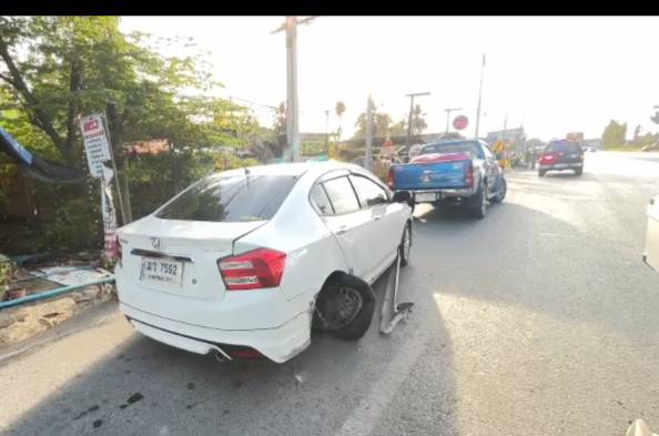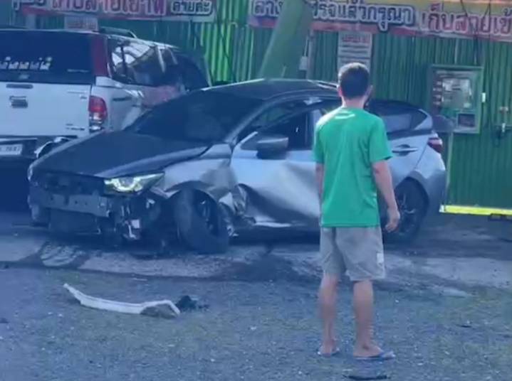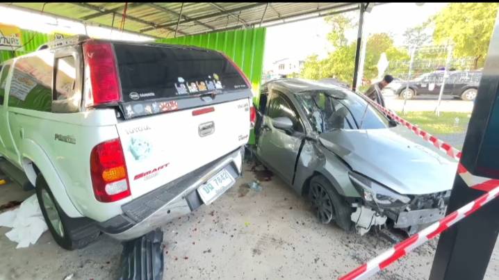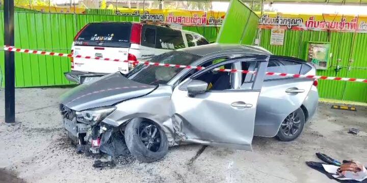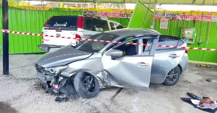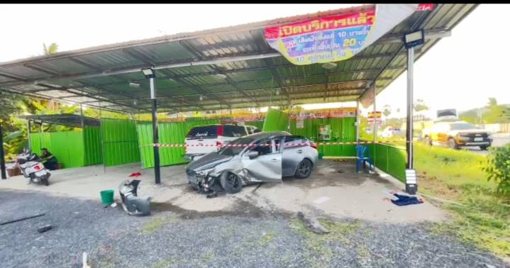 เก๋งชนรถเก๋งจอดข้างทางหมุนฟาดเสาไฟฟ้าก่อน พุ่งทะลุชนกระบะจอดล้างในร้านคาร์แคร์ผู้โดยสารกระเด็กตกรถตาย1เจ็บสาหัสอีก1รายเล็กน้อย3ราย