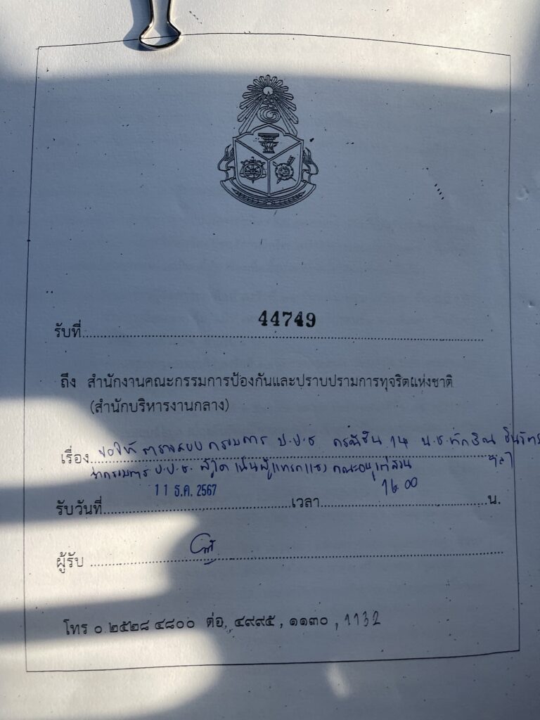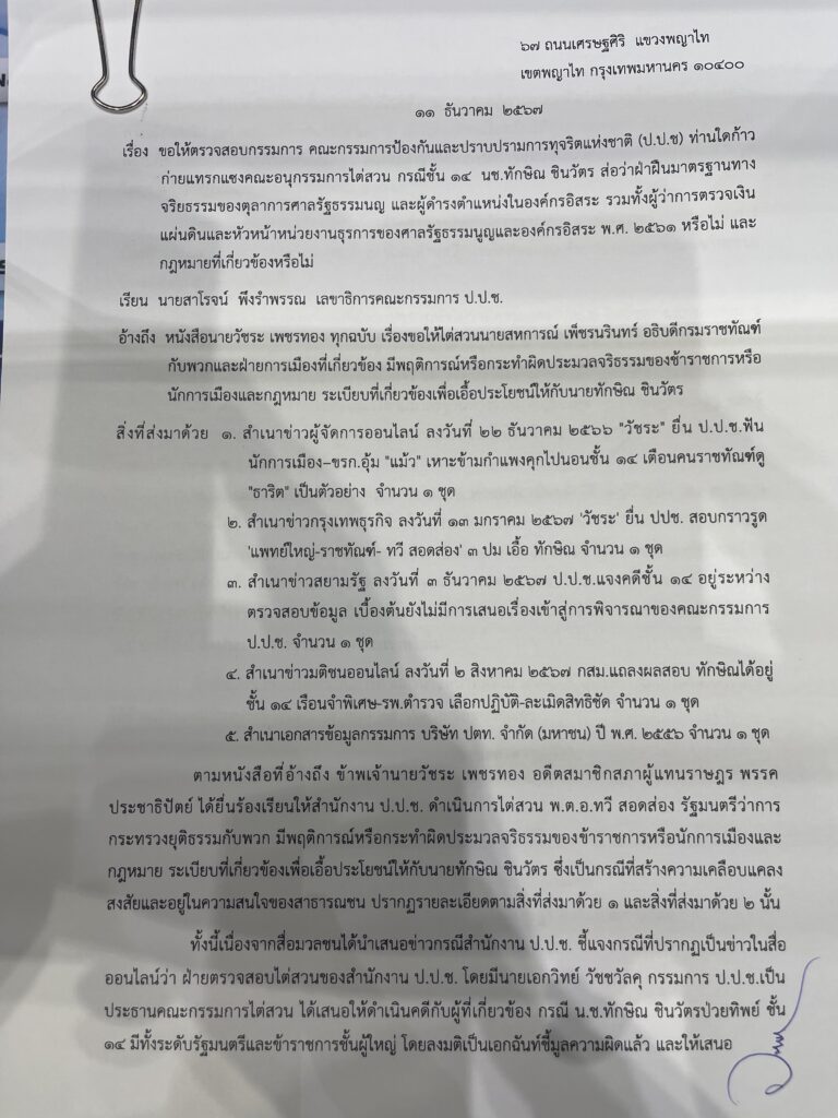 ที่สำนักงาน ป.ป.ช.นนทบุรี : วันที่ 11 ธันวาคม 2567 นายวัชระ เพชรทอง อดีตสมาชิกสภาผู้แทนราษฎร พรรคประชาธิปัตย์ ได้เดินทางเข้ายืนหนังสือ ต่อ นายสาโรจน์ พึงรำพรรณ เลขาธิการคณะกรรมการ ป.ป.ช. เพื่อขอให้ตรวจสอบกรรมการ คณะกรรมการป้องกันและปราบปรามการทุจริตแห่งชาติ (ป.ป.ช) ท่านใดก้าวก่ายแทรกแซงคณะอนุกรรมการไต่สวน กรณีชั้น ๑๔ นช.ทักษิณ ชินวัตร ส่อว่าฝ่าฝืนมาตรฐานทางจริยธรรมของตุลาการศาลรัฐธรรมนญ และผู้ดำรงตำแหน่งในองค์กรอิสระ รวมทั้งผู้ว่าการตรวจเงินแผ่นดินและหัวหน้าหน่วยงานธุรการของศาลรัฐธรรมนูญและองค์กรอิสระ พ.ศ. ๒๕๖๑ หรือไม่ และกฎหมายที่เกี่ยวข้องหรือไม่
