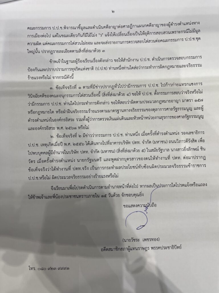 ตนในฐานะผู้ร้องเรียนเรื่องดังกล่าว จึงขอให้สำนักงาน ป.ป.ช. ดำเนินการตรวจสอบกรรมการป้องกันและปราบปรามการทุจริตแห่งชาติ (ป.ป.ช) ท่านหนึ่งท่านใด มีพฤติการณ์ส่อว่ากระทำการผิดกฎหมายและจริยธรรมร้ายแรงหรือไม่ จากกรณีดังนี้