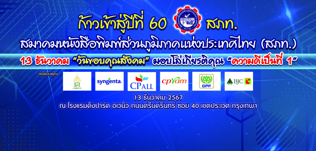สมาคมหนังสือพิมพ์ส่วนภูมิภาคแห่งประเทศไทย จึงขอเรียนเชิญท่านสมาชิกสมาคมทุกๆ ท่าน,สื่อมวลชน,ผู้ประกอบอาชีพสื่อ และบุคคลที่รู้จักคุ้นเคย กับสมาคมหนังสือพิมพ์ส่วนภูมิภาคแห่งประเทศไทย ร่วมงาน “ก้าวเข้าสู่ปีที่ 60 สมาคมหนังสือพิมพ์ส่วนภูมิภาคแห่งประเทศไทย” ในโอกาสนี้ด้วย ขอกราบขอบพระคุณล่วงหน้าเป็นอย่างสูง