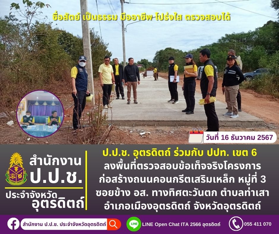 วันจันทร์ที่ 16 ธันวาคม 2567 นางสาววิชญา นพชินวงศ์ ผู้อำนวยการสำนักงาน ป.ป.ช. ประจำจังหวัดอุตรดิตถ์ มอบหมายเจ้าหน้าที่กลุ่มงานป้องกันการทุจริต ร่วมกับเจ้าหน้าที่สำนักงานคณะกรรมการป้องกันและปราบปรามการทุจริตในภาครัฐ เขต 6 (สำนักงาน ปปท. เขต 6) ลงพื้นที่ตรวจสอบเบื้องต้น ณ สำนักงานเทศบาลตำบลท่าเสา เพื่อขอทราบข้อเท็จจริงและตรวจสอบเอกสารหลักฐานที่เกี่ยวข้อง จากการตรวจสอบพบว่าทางเทศบาลตำบลท่าเสา ได้ทำสัญญาจ้างโครงการก่อสร้างถนนคอนกรีตเสริมเหล็ก หมู่ที่ 3 ซอยข้าง อส. ทางทิศตะวันตก ตำบลท่าเสา อำเภอเมืองอุตรดิตถ์ จังหวัดอุตรดิตถ์ ขนาดกว้าง 4.00 เมตร ยาว 375.00 เมตร หนา 0.15 เมตร ไหล่ทางลูกรังข้างละ 0.30 เมตร พื้นที่ผิวจราจรไม่น้อยกว่า 1,500 ตารางเมตร กับ ห้างหุ้นส่วนจำกัด อุตรดิตถ์จันทร์พานิช ปุ๋ย ยา 2013 ด้วยวิธีประกวดราคาอิเล็กทรอนิกส์ (e-bidding) งบประมาณตามสัญญาจ้าง 658,000 บาท (งบประมาณรายจ่ายประจำปีงบประมาณ พ.ศ. 2566) เริ่มสัญญาวันที่ 19 กันยายน 2567 สิ้นสุดสัญญาวันที่ 3 ธันวาคม 2567 จากการลงพื้นที่ตรวจสอบฯ ร่วมกับนายกเทศมนตรีตำบลท่าเสา และเจ้าหน้าที่ที่เกี่ยวข้อง ได้รับการชี้แจงในเบื้องต้นว่ามีการก่อสร้างรั้วแบ่งแนวเขตของประชาชนรุกล้ำเข้ามาในเขตพื้นที่ก่อสร้างถนนของเทศบาลตำบลท่าเสา ประมาณ 2.00 เมตร ประกอบกับการไฟฟ้าส่วนภูมิภาคจังหวัดอุตรดิตถ์ได้ปักเสาไฟฟ้าตามแนวเขตรั้วของประชาชน โดยภายหลังจากคณะกรรมการตรวจรับพัสดุของโครงการฯ ได้ออกตรวจสอบสถานที่ก่อสร้างฯ ได้แจ้งให้ประชาชนทำการรื้อถอนรั้วออกจากแนวเขตบริเวณพื้นที่ก่อสร้างของเทศบาลตำบลท่าเสา เมื่อประชาชนได้ดำเนินการรื้อถอนรั้วออกแล้ว จึงทำให้มีเสาไฟฟ้าอยู่ในแนวเขตพื้นที่การก่อสร้างฯ จำนวน 2 ต้น ซึ่งในวันที่ 29 พฤศจิกายน 2567 เทศบาลตำบลท่าเสาได้ทำหนังสือ ขอความอนุเคราะห์การไฟฟ้าส่วนภูมิภาคจังหวัดอุตรดิตถ์ ให้มาดำเนินการย้ายเสาไฟฟ้าที่อยู่ในแนวเขตพื้นที่การก่อสร้างฯ โดยในระหว่างที่ยังไม่ได้มีการย้ายเสาไฟฟ้า ผู้รับจ้างได้ดำเนินการเทคอนกรีตจนถึงระยะสิ้นสุดโครงการ จึงทำให้เกิดการเทคอนกรีตทับเสาไฟฟ้า ต่อมาในวันที่ 12 ธันวาคม 2567 การไฟฟ้าส่วนภูมิภาคจังหวัดอุตรดิตถ์ ได้เข้ามาทำการรื้อถอนและย้ายเสาไฟฟ้า จำนวน 2 ต้น บริเวณ กม. 0+360 และ กม. 0+374 และสายยึดโยง (สลึงกาย) จำนวน 1 จุด บริเวณ กม. 0+368 โดยมีคณะกรรมการตรวจรับพัสดุ ร่วมตรวจสอบ และพบว่าการย้ายเสาไฟฟ้าและสายสลิงยึดเสาไฟฟ้าดังกล่าว ทำให้เกิดเป็นช่องว่างบนพื้นที่คอนกรีต จำนวน 3 จุด ทำให้ถนนไม่เป็นผิวคอนกรีตเนื้อเดียวกัน โดยทางเทศบาลต