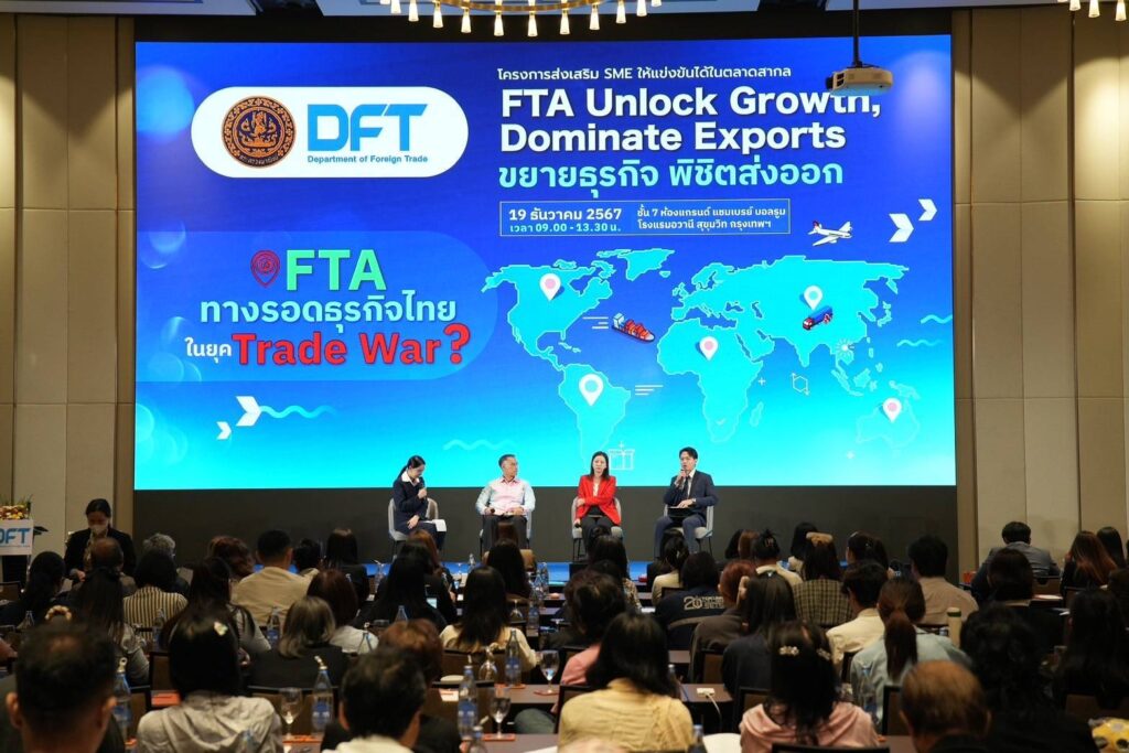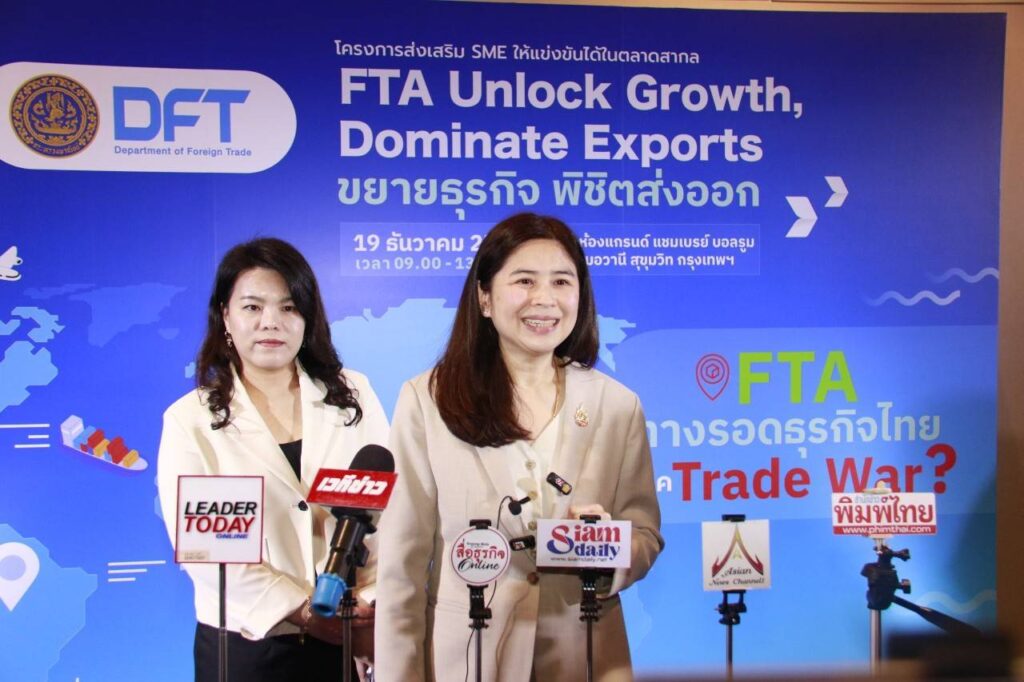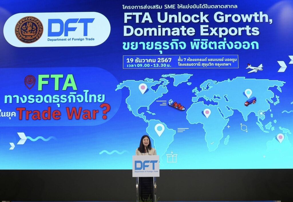 นางอารดา เฟื่องทอง อธิบดีกรมการค้าต่างประเทศ เปิดงานสัมมนาภายใต้โครงการส่งเสริม SME ให้แข่งขันได้ในตลาดสากล เรื่อง “FTA ขยายธุรกิจ พิชิตส่งออก” เมื่อวันพฤหัสบดีที่ 19 ธันวาคม 2567 ณ โรงแรมอวานี สุขุมวิท กรุงเทพฯ เชิญภาคเอกชนถกประเด็นร้อน โอกาสและความท้าทายจากสถานการณ์ทางการค้าโลกในยุค “ทรัมป์ 2.0” โดยกรมฯ เห็นว่า FTA จะเป็นทางรอดธุรกิจไทยในการส่งออก โดยจะช่วยกระจายความเสี่ยงการ ส่งออกไปยังตลาดใหม่และตลาดที่ไทยมี FTA ซึ่งผู้ส่งออกไทยจะมีแต้มต่อด้านภาษี พร้อมเน้นย้ำความสำคัญของการผลิตสินค้าโดยใช้วัตถุดิบภายในประเทศ (Local content) ให้ได้ถิ่นกำเนิดไทยตามกฎว่าด้วยถิ่นกำเนิดสินค้าที่กำหนดไว้ เพื่อป้องกันการถูกเพ่งเล็งว่าเป็นสินค้าที่ปลอมแปลงหรือแอบอ้างถิ่นกำเนิดจากประเทศที่สหรัฐฯ มีแนวโน้มดำเนินนโยบายกีดกันทางการค้าแบบแข็งกร้าว