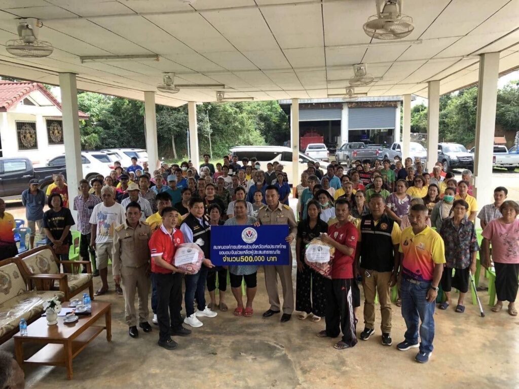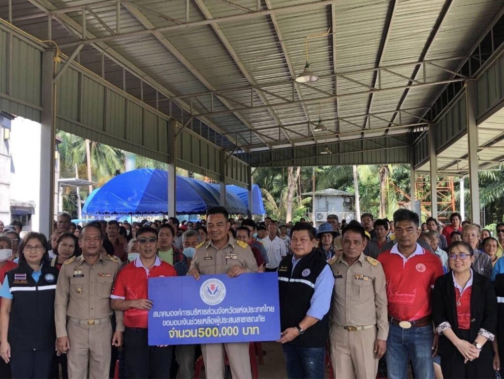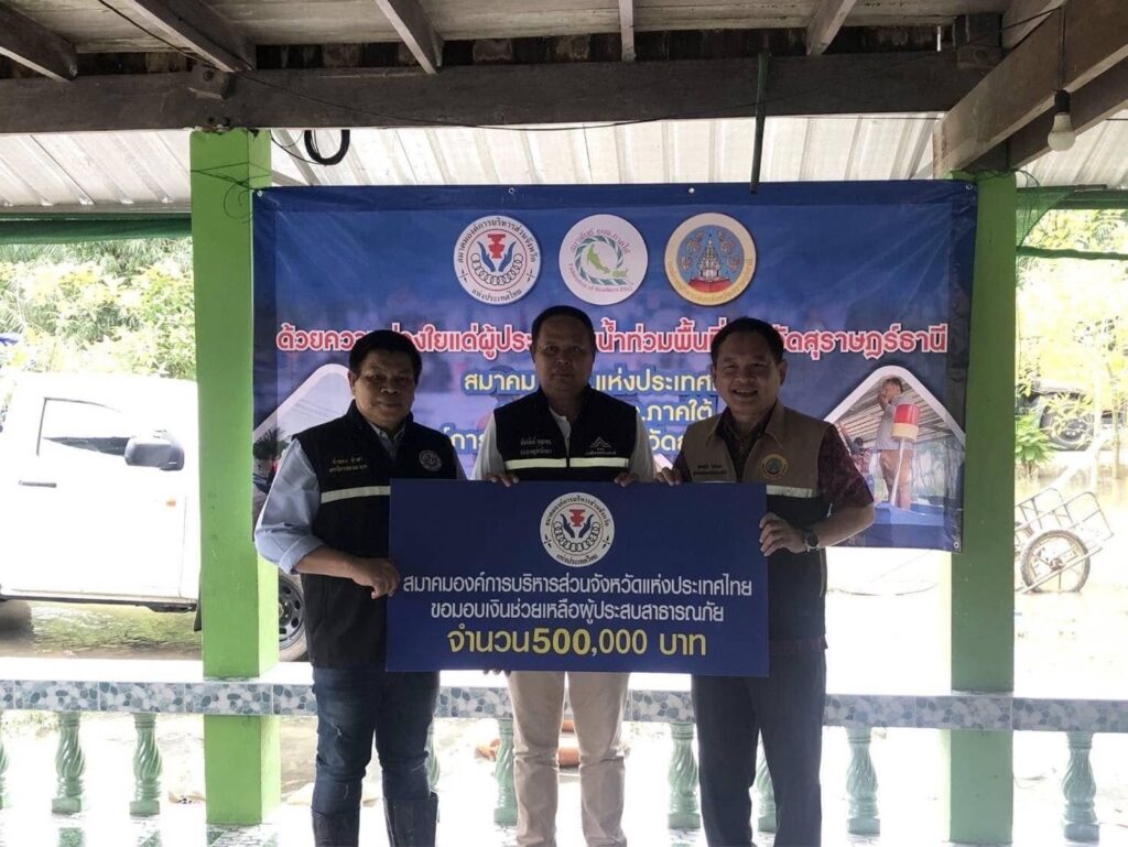 จากเหตุการณ์ดังกล่าว พลตำรวจโท คำรณวิทย์ ธูปกระจ่าง นายกองค์การบริหารส่วนจังหวัดปทุมธานี (อุปนายก ปฎิบัติหน้าที่แทน) นายกสมาคมองค์การบริหารส่วนจังหวัดแห่งประเทศไทย มอบหมายให้นายจำลอง ขำสา เลขาธิการสมาคมฯ และ เจ้าหน้าที่สมาคมฯ ลงพื้นที่ พร้อมทั้งมอบเงินช่วยเหลือจำนวน 500,000 บาท ทั้ง 3 พื้นที่ ที่ได้รับผลกระทบหนัก ซึ่งสมาคมองค์การบริหารส่วนจังหวัดแห่งประเทศไทย จะเป็นศูนย์กลางประสานงานกับองค์การบริหารส่วนจังหวัด ทั่วประเทศ ซึ่งเป็นไปตามยุทธศาสตร์สมาคมองค์การบริหารส่วนจังหวัดแห่งประเทศไทย ข้อที่ 4 คือการแก้ไขปัญหา บรรเทาความเดือดร้อนของประชาชน กรณีที่องค์การบริหารส่วนจังหวัด ซึ่งเป็นสมาชิกสมาคมองค์การบริหารส่วนจังหวัดแห่งประเทศไทย ได้รับผลกระทบอันเกิดจากกระบวนการทำงาน ตลอดจนภัยพิบัติต่างๆที่เกิดขึ้นในแต่ละพื้นที่จะพึ่งพา ช่วยเหลือกันเพื่อช่วยกันแก้ปัญหาต่างๆ ให้เสร็จสิ้นหรือบรรเทาความเดือดร้อนได้ทันท่วงที