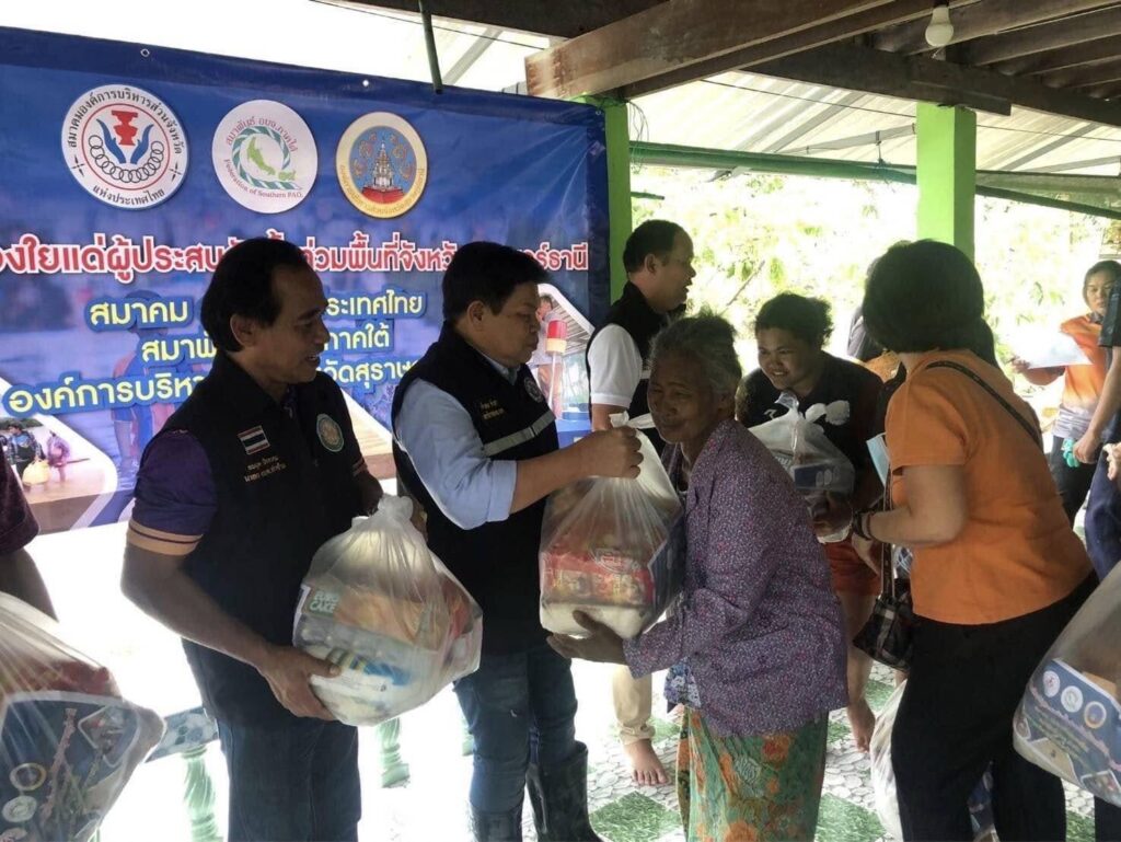 วันที่ 19 ธันวาคม 2567 พลตำรวจโท คำรณวิทย์ ธูปกระจ่าง นายกองค์การบริหารส่วนจังหวัดปทุมธานี (อุปนายก ปฎิบัติหน้าที่แทน) นายกสมาคมองค์การบริหารส่วนจังหวัดแห่งประเทศไทย มอบหมายให้นายจำลอง ขำสา เลขาธิการสมาคมฯ และ เจ้าหน้าที่สมาคมฯ ลงพื้นที่ ภาคใต้ซับน้ำตาชาวใต้จากเหตุอุทกภัยน้ำท่วม 2 จังหวัด จำนวน 3 จุดได้แก่ จังหวัดสุราษฎร์ธานี ในพื้นที่ ตำบลท่าข้าม อำเภอพุนพิน จังหวัดสุราษฎร์ธานี โดยมีนายพันธ์ศักดิ์ บุญแทน สส.สุราษฎร์ธานี นายฉัตรชนัย โนต๊ะยศ ปลัดองค์การบริหารส่วนจังหวัดสุราษฏร์ธานี และ นายอมฤต นิจอาคม นายกองค์การบริหารส่วนตำบลท่าข้าม และเจ้าหน้าที่ฯ อบจ. ลงพื้นที่ช่วยเหลือผู้ประสบอุทกภัยน้ำท่วม และจังหวัดชุมพร ในพื้นที่ขององค์การบริหารส่วนตำบลทุ่งคาและองค์การบริหารส่วนตำบลวิสัยเหนือ โดยมี นายนพพร อุสิทธิ์ นายกองค์การบริหารส่วนจังหวัดชุมพร ผู้บริหารข้าราชการ และเจ้าหน้าที่ฯ อบจ. ลงพื้นที่ช่วยเหลือผู้ประสบอุทกภัยน้ำท่วม