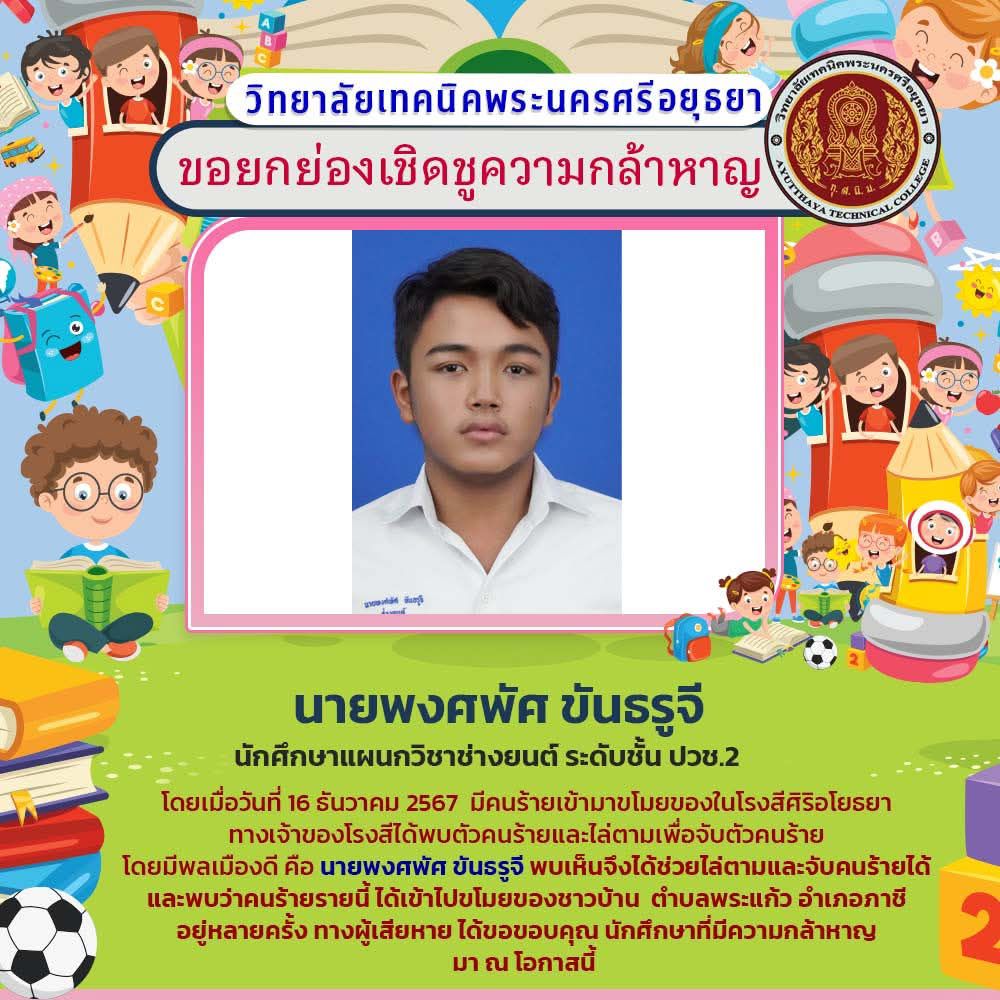 ผู้อำนวยการมยุรี ศรีระบุตร วิทยาลัยเทคนิคพระนครศรีอยุธยา ได้กล่าวชื่นชมในความกล้าหาญของนักเรียนและนักศึกษา พร้อมแสดงความภาคภูมิใจที่เด็กๆ ได้แสดงถึงความมีน้ำใจและคุณธรรมในการช่วยเหลือผู้อื่น “การสอนให้เด็กๆ เป็นคนดีและมีจิตเมตตา เป็นสิ่งที่เราให้ความสำคัญเสมอ และเหตุการณ์นี้เป็นเครื่องพิสูจน์ถึงความสำเร็จในเรื่องนี้ ตามที่ รมว.ศธ. เพิ่มพูน ชิดชอบ ได้เน้นย้ำนโยบายหลักคือ “เรียนดี มีความสุข”ด้วยแนวทาง “ทำดี ทำได้ ทำทันที” ”