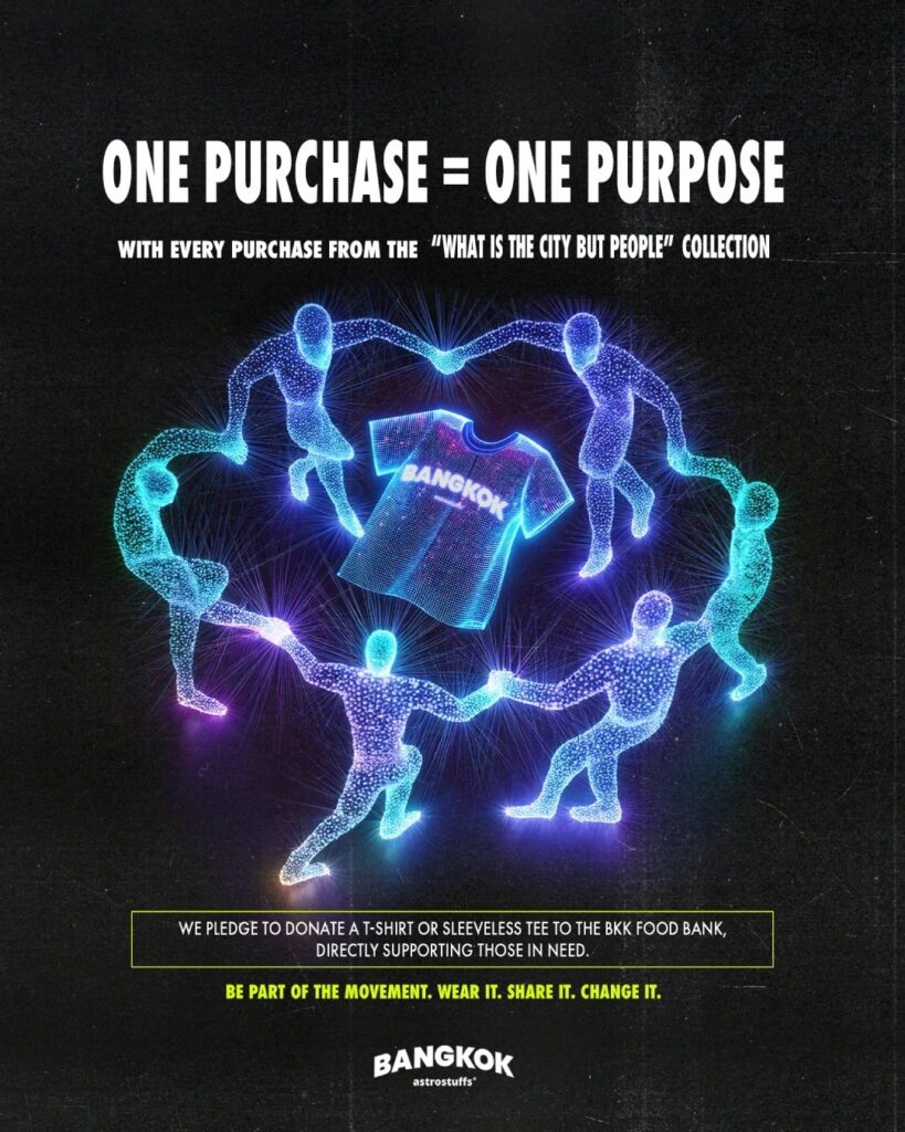 ASTRO Stuffs (แอสโตร สตัฟส์) แบรนด์แฟชั่นของ ‘ไบร์ท วชิรวิชญ์ ชีวอารี’ นำเสนอคอลเลคชั่นใหม่ ‘WHAT IS THE CITY BUT PEOPLE’ ที่ไม่เพียงแค่ใส่แล้วดูดี แต่ยังสร้างผลกระทบต่อสังคมได้จริง ด้วยทุกการสั่งซื้อจากคอลเลคชั่นนี้ เราจะส่งต่อเสื้อยืดหรือเสื้อแขนกุด 1 ตัวให้กับผู้ที่ขาดแคลนผ่านโครงการ BKK Food Bank