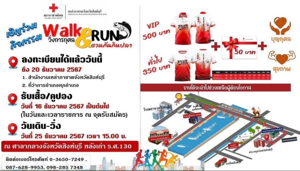 วันที่ 25 ธันวาคม 2567 เวลา15.00 น.ขอเชิญร่วมเดิน-วิ่งกับเหล่ากาชาดจังหวัดสิงห์บุรี ณ ศาลากลางร.ศ.130 หน้าเขื่อนริมแม่น้ำเจ้าพระยา และช่วงเย็นมีกิจกรรมขายข้าวไข่เจียว จานละ 10 บาท เพื่อหารายได้ช่วยเหลือผู้ยากไร้และผู้ประสบภัยพิบัติ ตลอดงาน(ณ บริเวณด้านหน้าสำนักงานเหล่ากาชาดจังหวัดสิงห์บุรี)