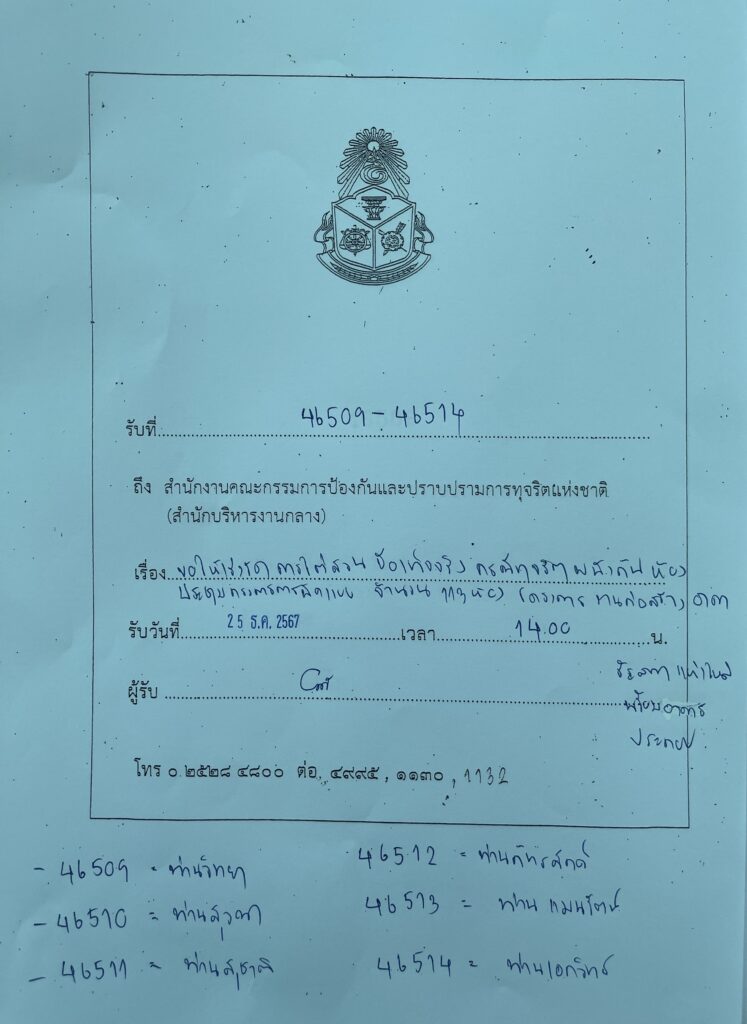 อนึ่งขอให้สำนักงาน ป.ป.ช. ดำเนินการกันข้าราชการชั้นผู้น้อยที่ให้ความร่วมมือในการสอบสวนอันเป็นประโยชน์ต่อทางราชการไว้เป็นพยานด้วย