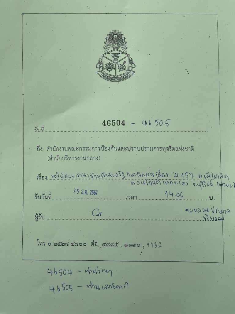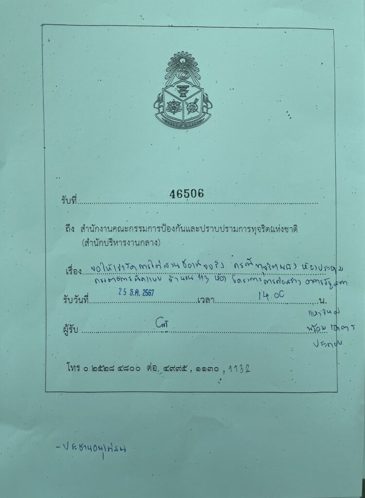 ตนในฐานะอดีตสมาชิกสภาผู้แทนราษฎร พรรคประชาธิปัตย์ ขอให้สำนักงาน ป.ป.ช. ดำเนินการไต่สวน นายพรพจน์ เพ็ญพาส อธิบดีกรมที่ดิน คณะกรรมการสอบสวนตามความในมาตรา 61 แห่งประมวลกฎหมายที่ดิน ลงวันที่ 12 พฤษภาคม 2566 กับพวก รวมถึงนักการเมืองที่เกี่ยวข้องทุกรายส่อว่าปฏิบัติหรือละเว้นการปฏิบัติหน้าที่โดยมิชอบหรือทุจริตหรือไม่ กรณีไม่เพิกถอนโฉนดเขากระโดง จ.บุรีรัมย์ และไม่ปฏิบัติตามคำพิพากษาศาลฎีกาที่ 842-876/2560 คำพิพากษาศาลฎีกาที่ 8027/2561 ทำให้การรถไฟฟ้าแห่งประเทศไทย (รฟท.) ได้รับความเสียหายอย่างร้ายแรงนั้น