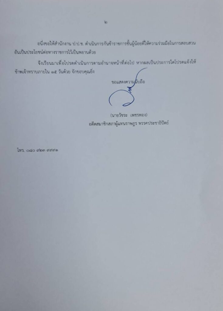 ตนมาวันนี้ เพื่อขอให้ ป.ป.ช. เร่งดำเนินการไต่สวนข้อเท็จจริงทั้ง 2 กรณีดังกล่าวข้างต้น ซึ่งพี่น้องประชาชนให้ความสนใจติดตามถามไถ่กับตนมาตลอด จึงขอให้ ป.ป.ช.โปรดเร่งดำเนินการตามอำนาจหน้าที่ต่อไป หากผลเป็นประการใดโปรดแจ้งให้ตน และพี่น้องประชาชนทราบภายใน 15 วันด้วย จักขอบคุณยิ่ง…นายวัชระ กล่าวทิ้งท้าย