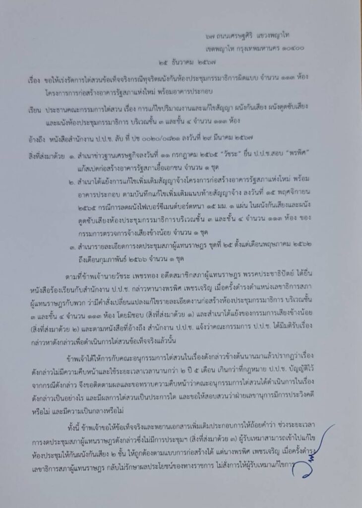 ทั้งนี้ ตนขอให้ข้อเท็จจริงและพยานเอกสารเพิ่มเติมประกอบการให้ถ้อยคำว่า ช่วงระยะเวลาการงดประชุมสภาผู้แทนราษฎรดังกล่าวซึ่งไม่มีการประชุมฯ ผู้รับเหมาสามารถเข้าไปแก้ไขห้องประชุมให้กันผนังกันเสียง 2 ชั้น ให้ถูกต้องตามแบบการก่อสร้างได้ แต่นางพรพิศ เพชรเจริญ เมื่อครั้งดำรงเลขาธิการสภาผู้แทนราษฎร กลับไม่รักษาผลประโยชน์ของทางราชการ ไม่สั่งการให้ผู้รับเหมาแก้ไขการก่อสร้างให้ถูกแบบจึงเป็นการเอื้อประโยชน์ให้กับผู้รับเหมา ข้ออ้างที่ว่าติดการประชุมสภาผู้แทนราษฎรของทุกฝ่ายที่กล่าวอ้าง จึงเป็นรายงานเท็จต่อทางราชการ ย่อมไม่สามารถรับฟังได้
