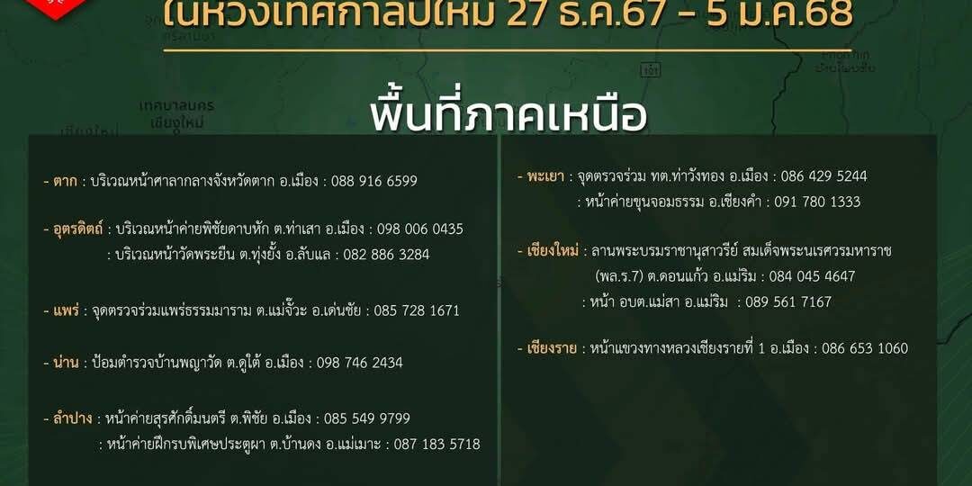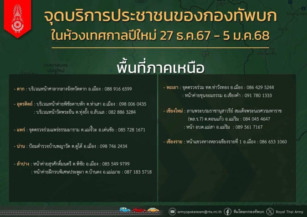 ในห้วงเทศกาลปีใหม่นี้ กองทัพบกร่วมกับศูนย์อำนวยการป้องกันและลดอุบัติเหตุทางถนน กรมป้องกันและบรรเทาสาธารณภัย กระทรวงมหาดไทย จัดตั้งจุดบริการประชาชนแบบครบวงจร ตั้งแต่ 27 ธ.ค.67 – 5 ม.ค.68 ในพื้นที่ ภาคเหนือ 12 จุด เพื่อดูแลความปลอดภัย และให้บริการประชาชนในการเดินทาง ทั้งในเส้นทางหลัก และเส้นทางที่เป็นจุดเสี่ยงหรือพบอุบัติเหตุบ่อยครั้ง โดยจุดบริการประชาชนเปิดให้บริการสำหรับผู้ที่สัญจรไปมาได้ใช้ในการพักรถระหว่างการเดินทาง ลดความคับคั่งของการจราจร ลดอุบัติเหตุจากความเหนื่อยล้าในการขับรถทางไกลและพฤติกรรมเมาแล้วขับ พร้อมอำนวยความสะดวกและให้ความช่วยเหลือในรูปแบบต่าง ๆ อาทิ การแนะนำเส้นทาง, การปฐมพยาบาลโดยเจ้าหน้าที่เสนารักษ์, การช่วยเหลือด้วยเครื่องมือช่างเบื้องต้น, บริการอุปกรณ์ชาร์จไฟฟ้าสำหรับมือถือ และห้องสุขา นอกจากนี้ยังสามารถแจ้งเหตุต่าง ๆ ได้อีกด้วย ซึ่งจะมีเจ้าหน้าที่ทหาร จิตอาสา เจ้าหน้าที่จากส่วนราชการจังหวัด และเจ้าหน้าที่ตำรวจประจำจุด คอยดูแล ให้ความช่วยเหลือตลอด 24 ชั่วโมง