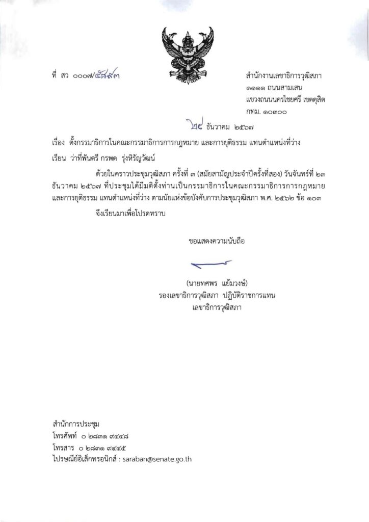 ว่าที่ พันตรี กรพด รุ่งหิรัญวัฒน์ สมาชิกวุฒิสภา ได้รับการเห็นชอบจาก สมาชิกวุฒิสภาทั้งหมด 166 เสียงได้คะแนนเสียง 155 ต่อ 6 เสียง งดออกเสียง 5 ให้ดำรงตำแหน่ง เป็น กรรมาธิการในคณะกรรมาธิการการ กฎหมายและการยุติธรรม วุฒิสภา