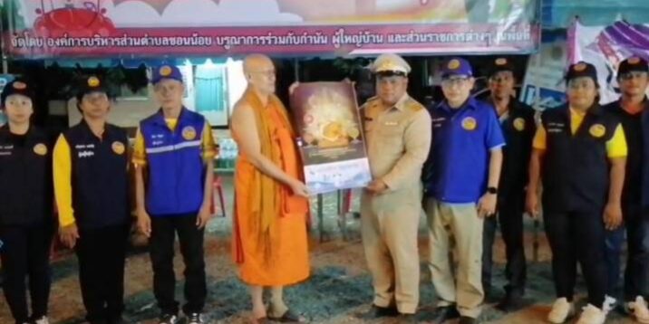ประพรมน้ำมนต์ให้กับผู้ใช้รถใช้ถนนทุกคันที่สัญจรผ่านไปมา บริเวณ ถนนสายลพบุรี-วังม่วง ตำบลพัฒนานิคม อำเภอพัฒนานิคม จังหวัดลพบุรี