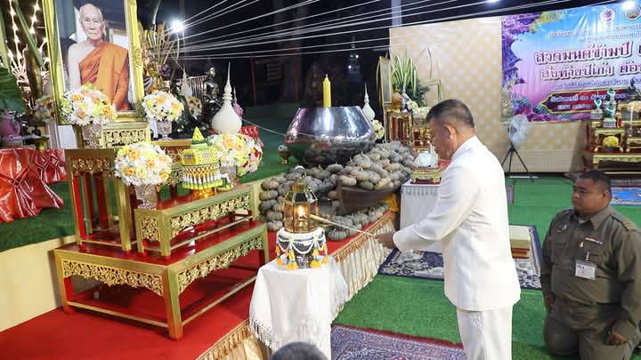 ในส่วน มณฑลพิธี หน้าหลวงพ่อโต วัดเสาธงทอง พระอารามหลวง ตำบลท่าหิน อำเภอเมือง จังหวัดลพบุรี นายปรัชญา เปปะตัง รองผู้ว่าราชการจังหวัดลพบุรี เป็นประธาน พร้อมด้วย นายประยูร ศิริวรรณ รองผู้ว่าราชการจังหวัดลพบุรี นำเหล่าพุทธศาสนิกชน จำนวนมากที่พร้อมใจกันนุ่งขาว ห่มขาว เข้าร่วมกิจกรรม เค้าดาวน์ สวดมนต์ข้ามปี พร้อมเจริญจิตภาวนาส่งท้ายปีเก่า ต้อนรับปีใหม่ 2568 โดยมี พระครูสิริจริยาภรณ์ เจ้าคณะอำเภอเมืองลพบุรี เจ้าอาวาสวัดเสาธงทอง พระอารามหลวง