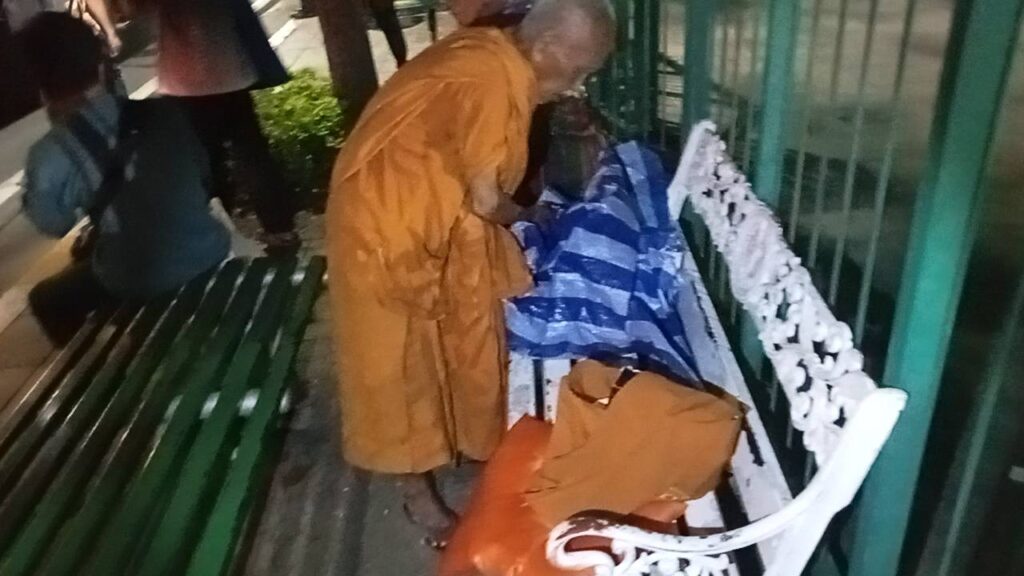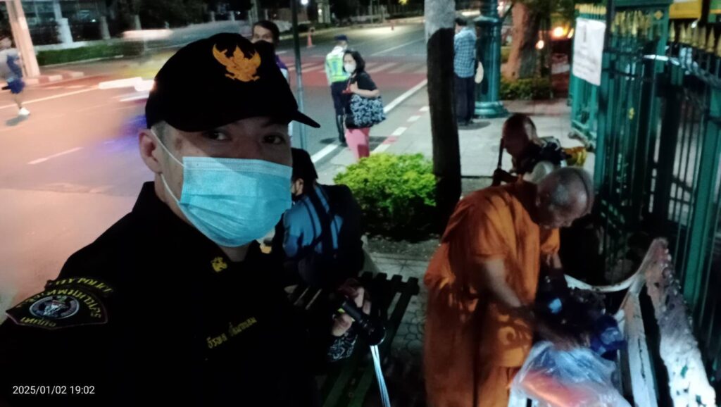 เบื้องต้นจากการลงพื้นที่ตรวจสอบ บริเวณป้ายรถเมล์ ริมรั้วเขียวสนามหลวง ฝั่งตรงกันข้าม มหาลัยธรรมศาสตร์ ( ท่าพระจันทร์ ) พบ พระสงฆ์แอบมาหลับนอนบนเก้าอี้ที่มีไว้ให้ประชาชนนั่รอรถเมล์ ต่อมา สายตรวจเทศกิจชุด2511 ได้ประเมิณดูเเล้วว่า ไม่สวยงามอาจทำให้ภาพลักษณ์เสีย อีกทั้ง มีนักท่องเที่ยวต่างชาติและประชาชน มายืนรอรถเมล์ หนาเเน่น เพื่อไม่ให้ภาพลักษณ์ของการเที่ยวประเทศไทย เสียหาย และ เพื่อป้องกันอันตรายรถเฉี่ยวชนประชาชนตรงดังกล่าว สายตรวจเทศกิจชุด2511 ได้เข้าทำการปลุกเรียก พร้อมทั้ง ทำการซักถามว่าเป็นพระมาจากที่ไหน และ ต่อมาพระคนดังกล่าวได้ยอมรับ กับ เจ้าหน้าที่สายตรวจเทศกิจชุด2511ื ว่า ตน “เป็นพระปลอม ไม่มีใบสุทธิของพระ” โดยเวลาช่วงเช้า ตน ไปบิณฑบาตจากประชาชา ที่ ตลาดบางแค และ ตกเย็น จะมาหลับอาศัยพื้นที่ แถบสนามหลวง ถนนราชดำเนินกลาง ต่อมา สายตรวจเทศกิจชุด2511 ได้เเจ้งทำความเข้าใจและทำการผลักพระคนดังกล่าวออกนอกพื้นที่ต่อไป เหตุการณ์ทั่วไปปกติ