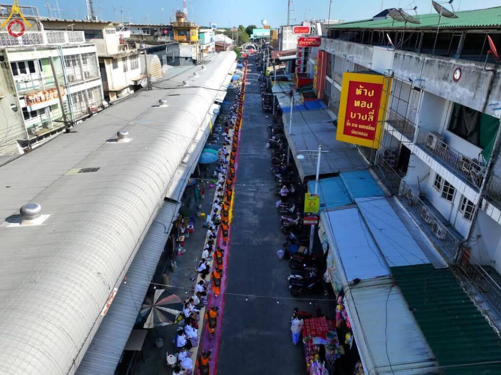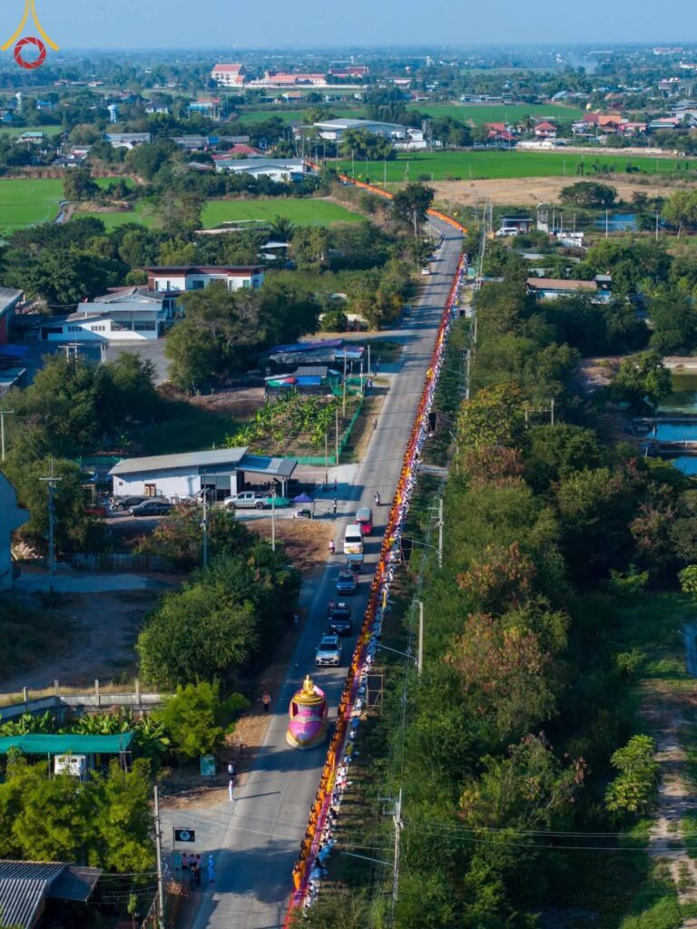 เริ่มต้นเดินกิโลเมตรที่ 0.0 จากที่ว่าการอำเภอสองพี่น้อง เลี้ยวซ้ายเข้าสู่ถนน3260 ผ่านหน้ารพ.สมเด็จพระสังฆราช ตลาดบางลี่ เลี้ยวขวาเข้าสู่เทศบาลอำเภอสองพี่น้อง เลี้ยวขวาเข้าสู่ถนนราษฏร์อุทิศ สิ้นสุดที่อนุสรณ์สถานมหาวิหารพระมงคลเทพมุนี(โลตัสแลนด์) รวมระยะทางทั้งสิ้น 6.2 กิโลเมตร มีพุทธศาสนิกชนจำนวนมากร่วมโปรยกลีบดอกเบญจทรัพย์และทรัพย์บานชื่นตลอดเส้นทาง
