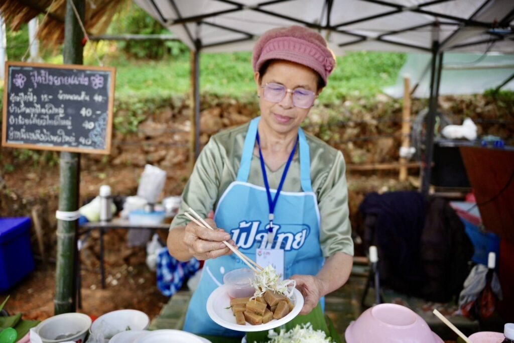 - อกไก่ย่างซอสสะเบี๊ยะ เมนูใหม่ที่ประยุกต์จากอาหารของชาวอาข่า นำชาชูอกไก่นุ่มมาเสิร์ฟคู่กับซอสรากชูที่ถูกปรุงรสมาอย่างพิถีพิถัน ทานคู่กับฟักทองญี่ปุ่นและผักกูดที่ชาวบ้านปลูกเองบนดอยตุง