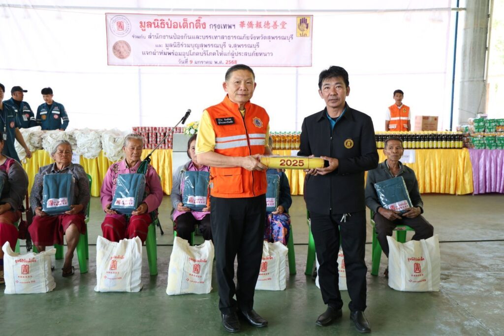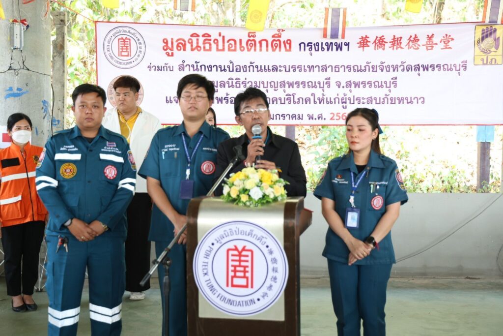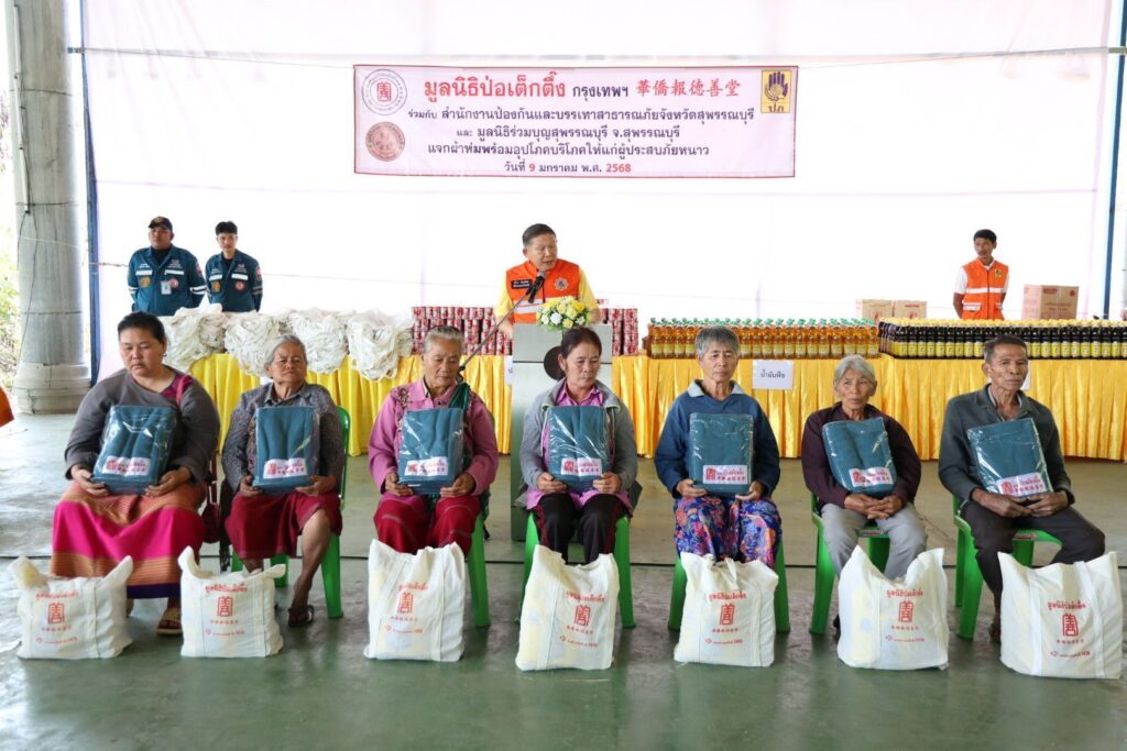 วันนี้ (วันพฤหัสบดีที่ 9 มกราคม พ.ศ. 2568) มูลนิธิป่อเต็กตึ๊ง นำโดย นายชุมพล บุญภักดี ผู้ช่วยหัวหน้าแผนกสาธารณภัย นำทีมสาธารณภัยลงพื้นที่แจกจ่ายผ้าห่มกันหนาว พร้อมเครื่องอุปโภคบริโภคลงพื้นที่แจกจ่ายผ้าห่มกันหนาว พร้อมเครื่องอุปโภคบริโภค ประกอบด้วย ข้าวสาร บะหมี่กึ่งสำเร็จรูป ปลากระป๋อง น้ำมันพืช น้ำปลา ให้แก่ผู้ประสบภัยหนาวในพื้นที่ ตำบลวังยาว และตำบลองค์พระ อำเภอด่านช้าง จังหวัดสุพรรณบุรี รวมผ้าห่มกันหนาวพร้อมเครื่องอุปโภคบริโภค รวม 750 ชุด รวมมูลค่าเป็นเงินทั้งสิ้น 412,500 บาท (สี่แสนหนึ่งหมื่นสองพันห้าร้อยบาทถ้วน) โดยมี นายพิริยะ ฉันทดิลก ผู้ว่าราชการจังหวัดสุพรรณบุรี พร้อมด้วย ผู้แทนจากกรมป้องกันและบรรเทาสาธารณภัย จังหวัดสุพรรณบุรี และ มูลนิธิร่วมบุญสุพรรณบุรี เป็นผู้ประสานงานและร่วมในพิธี ณ บริเวณวัดวังยาว ตำบลวังยาว และบริเวณโรงเรียนบ้านทุ่งมะกอก ตำบลองค์พระ อำเภอด่านช้าง จังหวัดสุพรรณบุรี