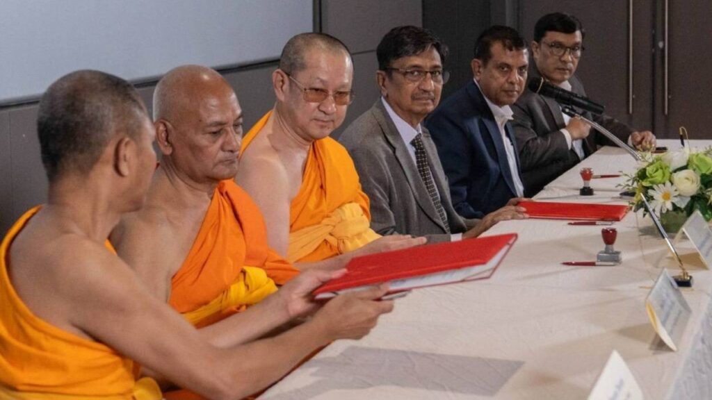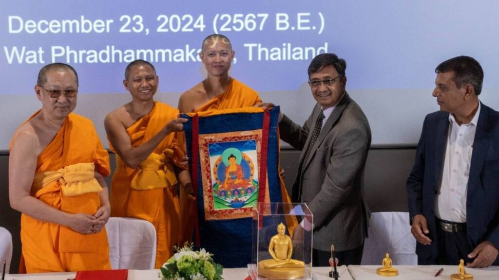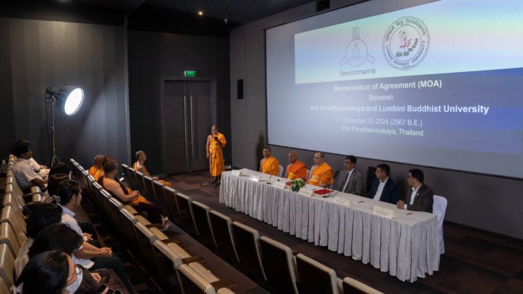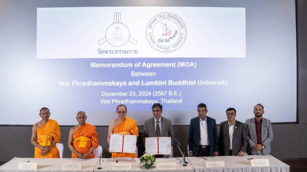สำหรับพิธีลงนามบันทึกข้อตกลงระหว่างวัดพระธรรมกายกับมหาวิทยาลัยพุทธศาสนาลุมพินี ประเทศเนปาล ทางด้านพระพุทธศาสนา เมื่อวันที่ 23 ธันวาคม 2567 ที่ผ่านมา ณ ห้องฉายสื่อชั้น 2 อาคาร 100 ปี คุณยายอาจารย์มหารัตนอุบาสิกาจันทร์ ขนนกยูง โดยทางผู้แทนวัดพระธรรมกาย นำโดย พระวิเทศน์ธรรมาภรณ์ ผู้ช่วยเจ้าอาวาสวัดพระธรรมกาย และประธานมูลนิธิธรรมกาย พร้อมด้วยคณะสงฆ์ อุบาสก อุบาสิการ และทางด้านผู้แทนมหาวิทยาลัยพุทธศาสนาลุมพินี นำโดย Dr.Subarna lal Bajracharya (ด๊อกเตอร์สุบารนะ ลาล บาราชยา) รองอธิการบดีมหาวิทยาลัยพุทธศาสนาลุมพินี, Dr.Manik Ratna Shakya (ด๊อกเตอร์มานิค รัตนะ ศากยะ) คณบดีคณะพุทธศาสนามหาวิทยาลัยพุทธศาสตลุมพินี, และ Dr.Tilak Ram Baracharya (ด๊อกเตอร์ติลัก ราม บาราชยา) นายทะเบียนมหาวิทยาลัยพุทธศาสนาลุมพินี
