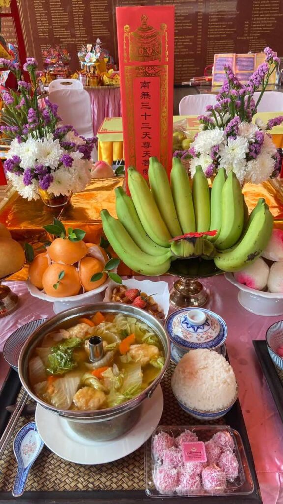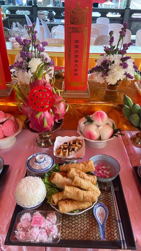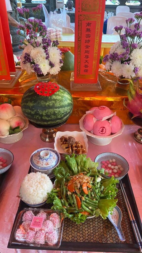 เวลา 11.00 น. สาธยายคัมภีร์สัทธรรมปุณฑริกสูตร สมันตมุขปริวรรต ว่าด้วยอานุภาพแห่งพระอวโลกิเตศวรโพธิสัตว์ (โพวมึ่งพิ่ง) เจริญอนุสติภาวนา ขอพรประสิทธิชัยให้ปราศจากทุกข์ภัย ได้รับพระกรุณารักษาจากพระโพธิสัตว์และปวงพระธรรมบาลทั้งหลาย