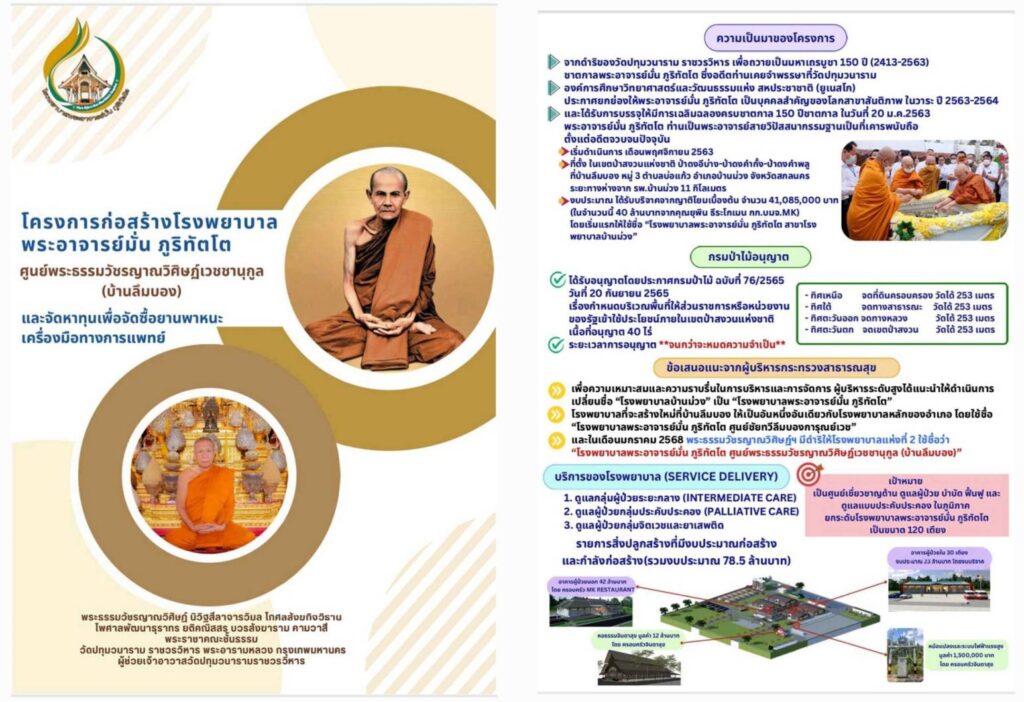 “และในการสร้างโรงพยาบาลพระอาจารย์มั่น ภูริทัตโต แห่งที่ 2 (ศูนย์พระธรรมวัชรญาณวิศิษฏ์เวชชานุกูล บ้านลึมบอง)นี้ จะทำให้ลดความแออัดของโรงพยาบาลและประชาชนในพื้นที่ใกล้เคียงสามารถเข้าถึงการดูแลรักษาได้สะดวกมากยิ่งขึ้น และโรงพยาบาลสามารถเพิ่มศักยภาพการให้บริการให้ครอบคลุมมากขึ้นตามสภาพปัญหาทางสุขภาพในปัจจุบัน”