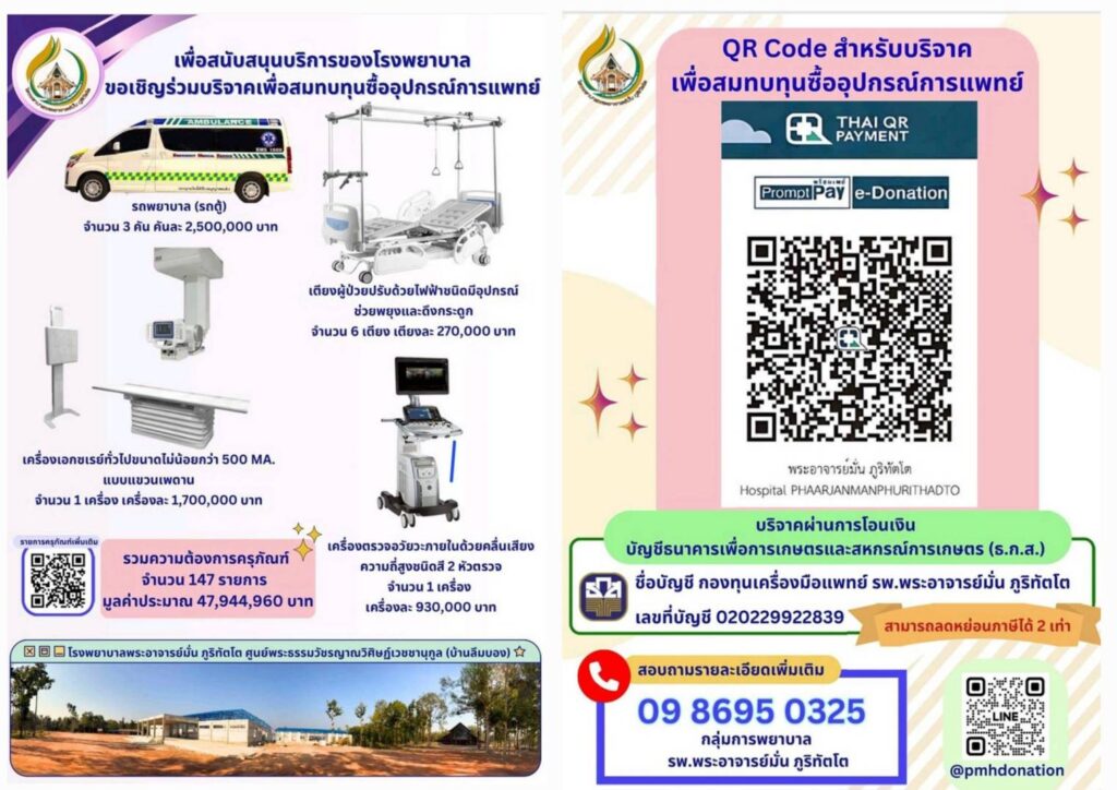 และในวันที่ 20 มกราคมนี้ เป็นวันครบรอบ 155 ปี ชาตกาลหลวงปู่มั่นฯ เพื่อเป็นมหาเถรบูชาต่อพระอาจารย์มั่น ภูริทัตโต จึงขอเชิญชวน พุทธศาสนิกชน และผู้มีจิตศรัทธา ร่วมบริจาคเพื่อจัดหาเครื่องมือแพทย์สำหรับโรงพยาบาลพระอาจารย์มั่น ภูริทัตโต ผ่านระบบ e-donation ซึ่งสามารถนำไปลดหย่อนภาษี ได้ 2 เท่า โดยสามารถบริจาค ได้ที่ บัญชีธนาคารเพื่อการเกษตรและสหกรณ์(ธ.ก.ส.) ชื่อบัญชี “กองทุนเครื่องมือแพทย์ รพ.พระอาจารย์มั่น ภูริทัตโต” เลขที่บัญชี 020229922839 หรือบริจาค ด้วย mobile application ของธนาคาร โดยสแกน QR code บริจาคผ่านระบบ e-donation โดยตรง สามารถติดต่อสอบถามได้ที่เบอร์โทร 0986950325 หรือ line official account @pmhdonation โดยสามารถบริจาคได้ตั้งแต่วันนี้เป็นต้นไป