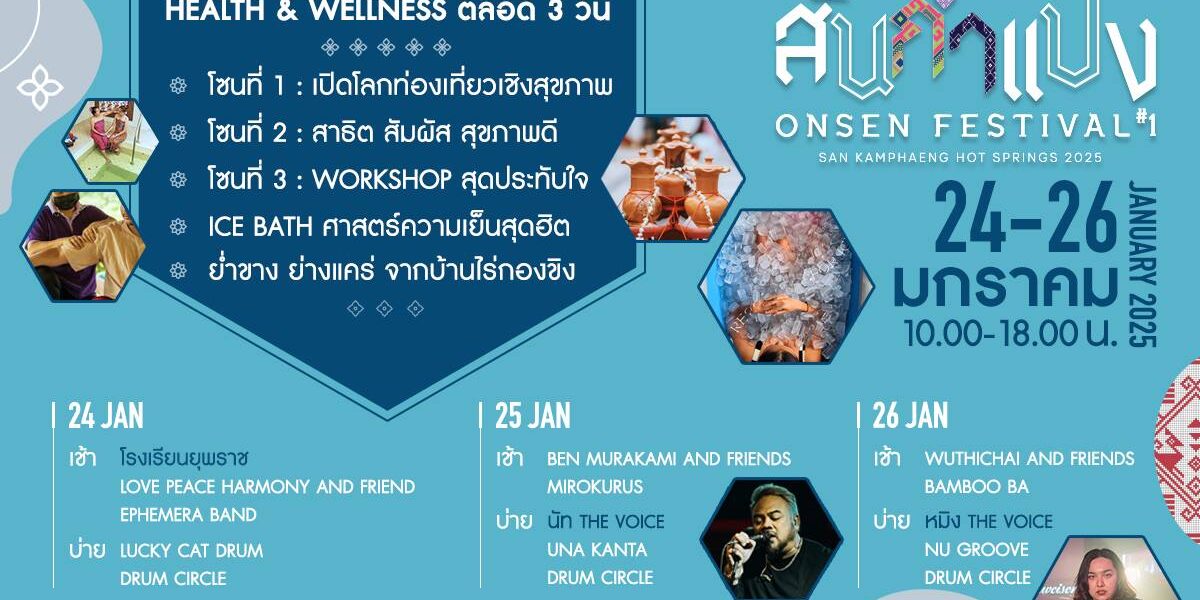 การท่องเที่ยวแห่งประเทศไทย (ททท.) ขอเชิญชวนทุกท่านร่วมสัมผัสประสบการณ์ท่องเที่ยว เชิงสุขภาพในงาน “สันกำแปง ONSEN FESTIVAL #1” ระหว่างวันที่ 24-26 มกราคม 2568 ณ กิจการน้ำพุร้อนสันกำแพง อำเภอแม่ออน จังหวัดเชียงใหม่ ภายใต้แนวคิด “Nature Therapy At San Kamphaeng” เพื่อเปิดมุมมองใหม่แห่งการพักผ่อนอย่างมีคุณภาพ ทั้งกาย ใจ และจิตวิญญาณผ่านกิจกรรมที่เชื่อมโยงสุขภาวะและวิถีชุมชนภายใต้พื้นฐานของความยั่งยืน