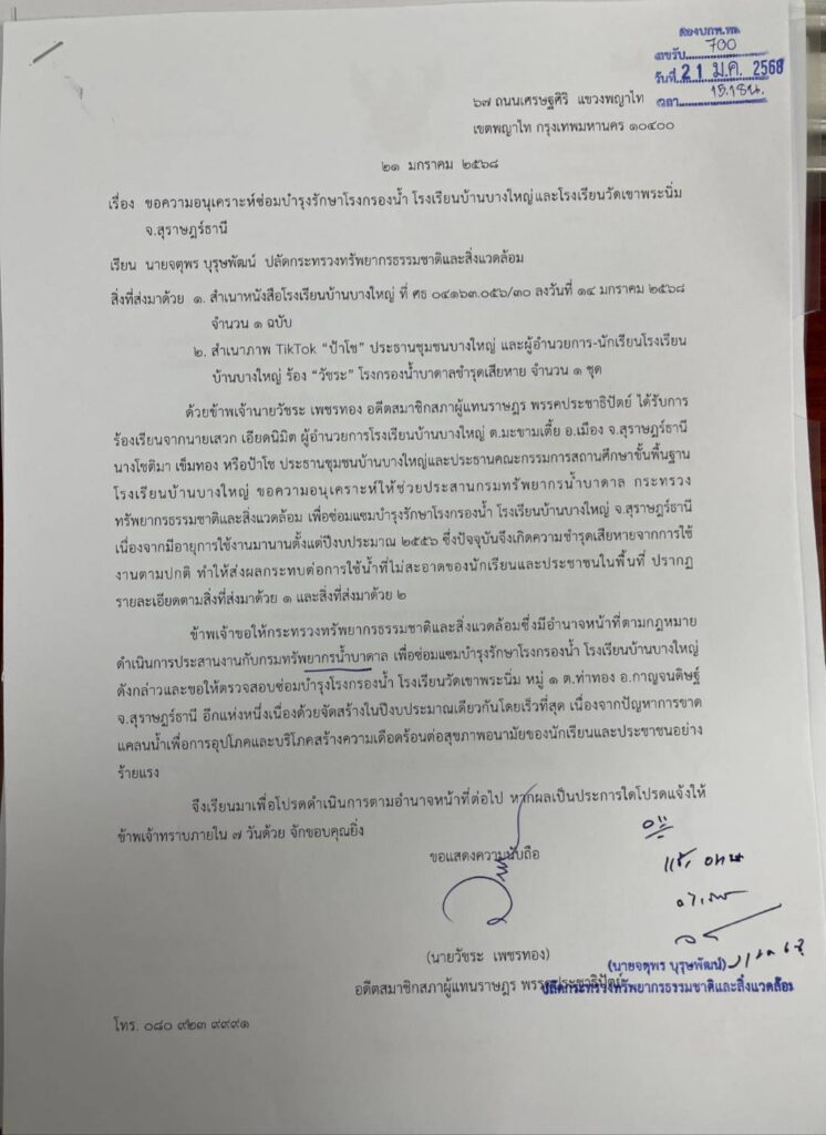 21 มกราคม 2567 นายวัชระ เพชรทอง อดีตสมาชิกสภาผู้แทนราษฎร พรรคประชาธิปัตย์ เปิดเผยกับผู้สื่อข่าวว่า วันนี้ตนเดินทางมาพบกับ นายจตุพร บุรุษพัฒน์ ปลัดกระทรวงทรัพยากรธรรมชาติและสิ่งแวดล้อม เนื่องก่อนหน้านี้ ได้รับการร้องเรียนจากนายเสวก เอียดนิมิต ผู้อำนวยการโรงเรียนบ้านบางใหญ่ ต.มะขามเตี้ย อ.เมือง จ.สุราษฎร์ธานี นางโชติมา เข็มทอง หรือป้าโช ประธานชุมชนบ้านบางใหญ่และประธานคณะกรรมการสถานศึกษาขั้นพื้นฐาน โรงเรียนบ้านบางใหญ่ ขอความอนุเคราะห์ให้ช่วยประสานกรมทรัพยากรน้ำบาดาล กระทรวงทรัพยากรธรรมชาติและสิ่งแวดล้อม เพื่อซ่อมแซมบำรุงรักษาโรงกรองน้ำ โรงเรียนบ้านบางใหญ่ จ.สุราษฎร์ธานี เนื่องจากมีอายุการใช้งานมานานตั้งแต่ปีงบประมาณ 2556 ซึ่งปัจจุบันจึงเกิดความชำรุดเสียหายจากการใช้งานตามปกติ ทำให้ส่งผลกระทบต่อการใช้น้ำที่ไม่สะอาดของนักเรียนและประชาชนในพื้นที่