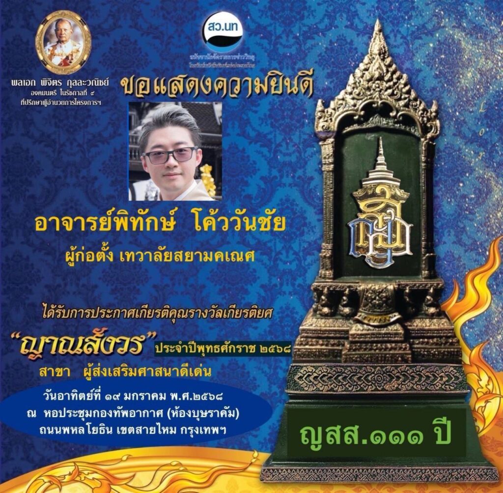 โดยได้รับเกียรติจาก พลตรีหม่อมราชวงศ์ วัยวัฒน์ จักรพันธุ์ ประธานมอบรางวัล โดยมีเหล่าคนบันเทิงและบุคคลในวงการบันเทิงได้รีบการประกาศเกียรติคุณรางวัลเกียรติยศ “ญาณสังวร” ดังนี้ เกียรติคุณสาขา ผู้ส่งเสริมศาสนาดีเด่น ได้แก่ ดร.เกศริน เอกธวัชกุล ดารานักแสดง ครูสอนเต้นในโครงการทูบีนัมเบอร์วัน ครูสมาธิ วัดธรรมมงคลฯ โดยหลวงพ่อวิริยังค์ สิรินธโร, เพี๊ยซ-กนกลดา บุตรพิมพา นักแสดง พิธีกร และอินฟูเอ็นเซอร์ช่อง มาดามเพี๊ยซ, ธนินทร์ วงศ์ปัญญาเสถียร (อาจารย์วินไท ไขนามเลข ศาสตร์ดวงดาว) คณาจารย์โหราธิบดี ในพระบรมราชินูปถัมภ์ และ อาจารย์พิทักษ์ โค้ววันชัย ผู้ก่อตั้ง เทวาลัยสยามคเณศ (โครงการ ม้าไม้การ์เด้นท์)